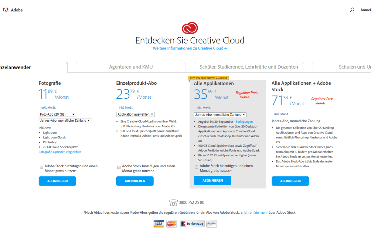 Normalerweise verlangt Adobe dafür 56,49 Euro pro Monat. Bis zum 30. September 2019 zahl man sehr gute 40 % weniger, nämlich 35,69 Euro pro Monat und 12 Monate. Nach den ersten 12 Monaten gelten dann wieder die regulären Konditionen, wenn es zwischendrin nicht wieder eine ähnliche Aktion gibt – was sehr wahrscheinlich ist.