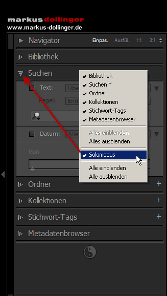 - Lightroom ist durch seine ausblendbaren Panels links und rechts übersichtlich. Allerdings führt das Ausklappen der einzelnen Funktionsgruppen schnell zu „überlangen“ Panels, bei denen man ständig scrollen muss. Der Solo-Modus schafft Abhilfe: Ist er aktiviert, klappt immer nur eine Funktion aus und die bisher aktive wird automatisch wieder eingerollt. Einfach einen rechten Mausklick auf eine freie Fläche im Panel und SOLOMODUS aktivieren (Bild1).