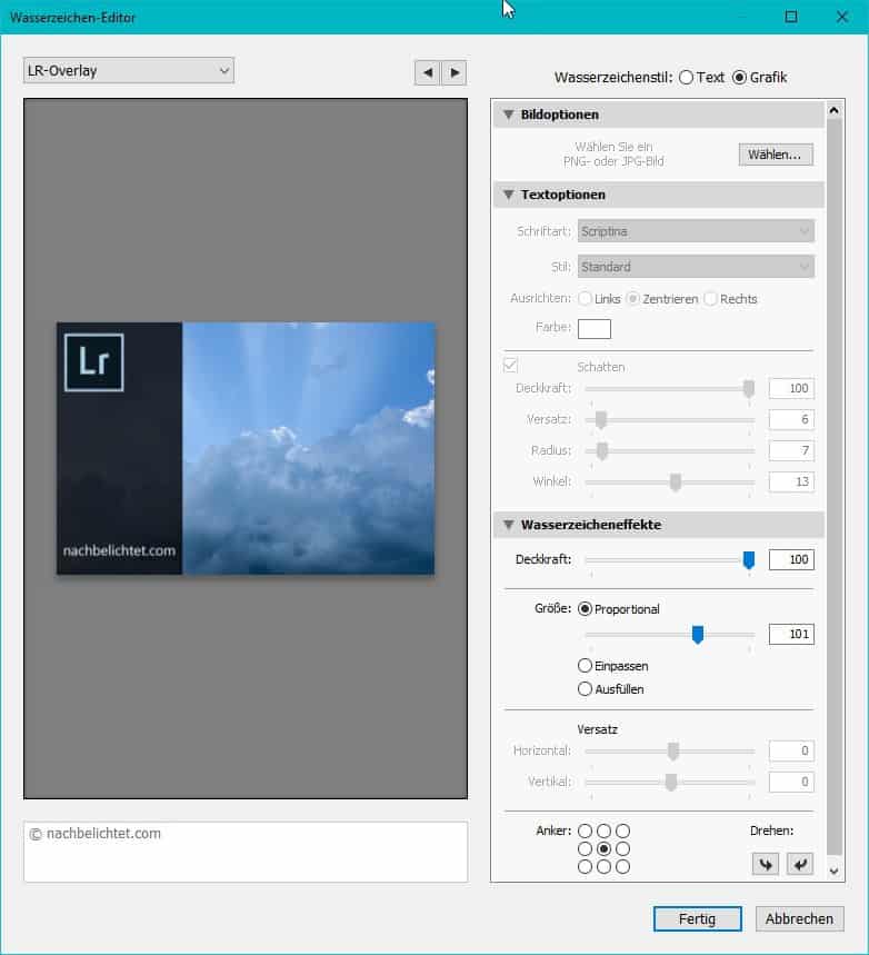 Mit den Wasserzeicheneinstellungen beim Export, lassen sich auch allerlei Texte und Einblendungen erstellen. Sogar Bilder (Logos etc.) können beim Export ins Bild integriert werden. Wenn man z. B. ein PNG-Bild mit Transparenz erstellt, kann man hier automatisch interessante Splash-Screens erstellen.
