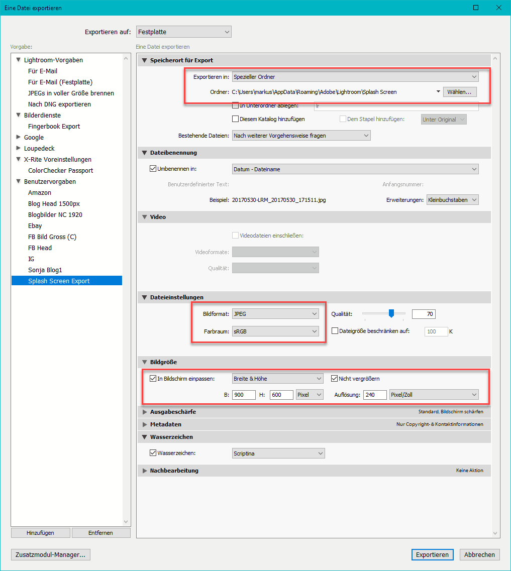 Nun kannst du dir z. B. auch noch ein eigenes Export-Preset basteln, das Fotos automatisch in der passenden Größe und in den richtigen Ordner speichert. Damit kannst du direkt aus Lightroom heraus Bilder für deine Splash Screens exportieren und hast bei jedem Programmstart Abwechslung.