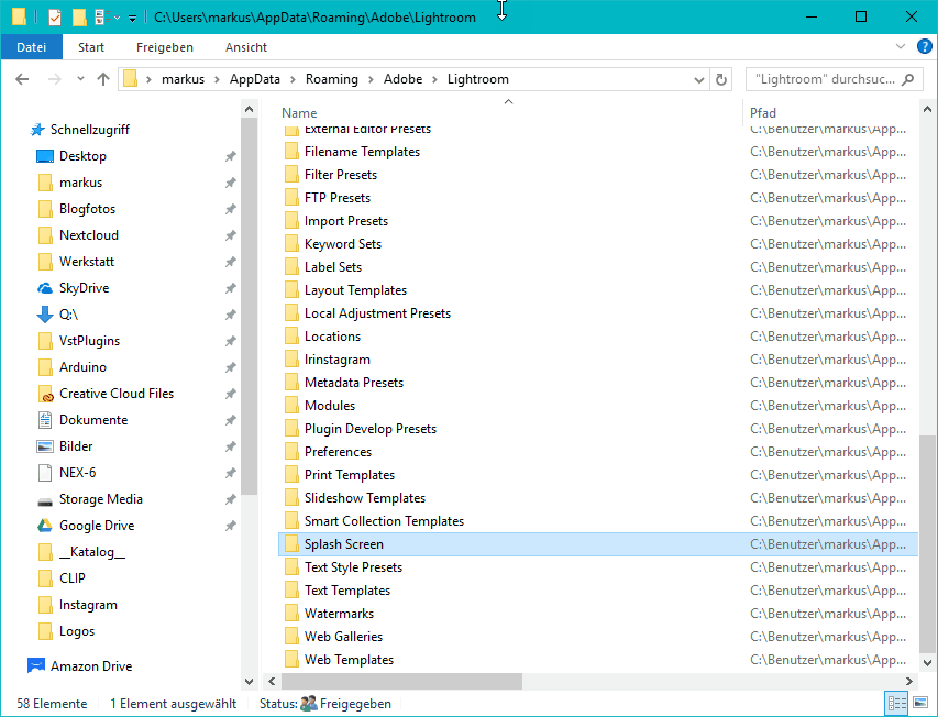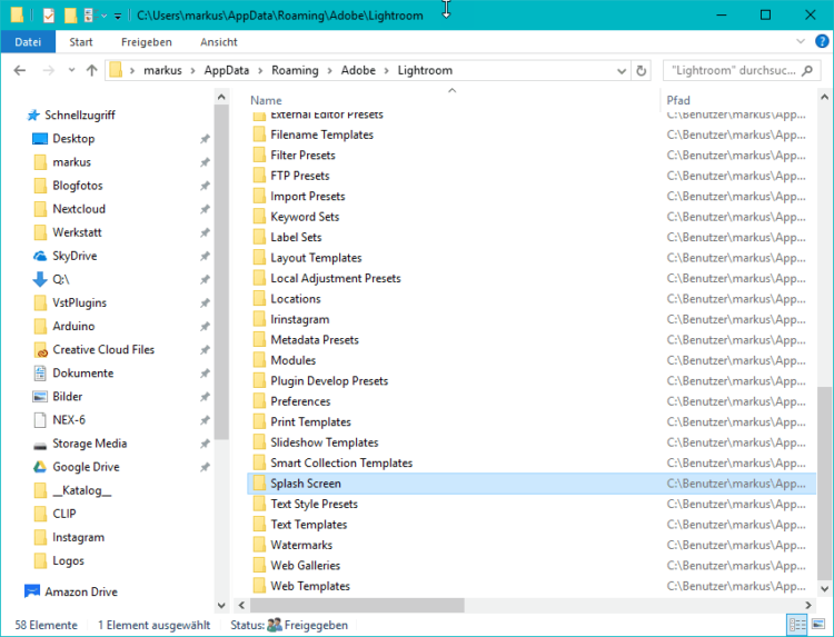 Gestatte mir noch den Hinweis, dass der Ordner „Splash Screen“ auf jeden Fall im User-Verzeichnis auf C: (Windows, wie in Deinem Screenshot abgebildet) sein muss, auch wenn man, wie ich, die Einstellungen zusammen mit dem Katalog auf einer anderen Partition speichert.