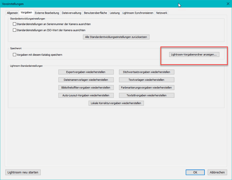Dazu musst du zunächst erst einmal ein Bild mit mindestens 900 x 600 Pixeln Größe (Seitenverhältnis 3:2!) anlegen und als PNG oder JPG speichern. Dann gehst du in die Lightroom Voreinstellungen unter Vorgaben und klickst auf Lightroom Vorgabenordner anzeigen …