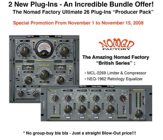 [image title=“Nomad Factory Plugin Aktion“ size=“medium“ id=“1255″ align=“left“ linkto=“http://nachbelichtet.com/wp-content/uploads//2008/10/nomad_factory_bundle_download.jpg“ ]Der bekannte Plugin-Hersteller Nomad Factory bietet vom 1. bis zum 15. November 08 ein Bundle aus 26 seiner Plugins für $499 an und nennt das Paket „Producer Pack“.