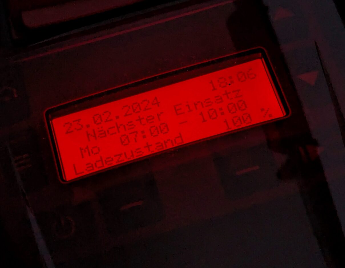 Heute, Ende Februar 2024, ist es bei uns in Oberfranken relativ warm und trocken. Daher war es Zeit für einen ersten Testlauf. Der Begrenzungsdraht vom Yardforce war noch verlegt. Also habe ich die Dockingstation des AL-KO Robolinho provisorisch aufgestellt und angeschlossen. Die AL-KO Intouch-App hatte ich bereits kurz nach der Lieferung verbunden und sie macht einen guten Eindruck. Wir haben im Garten komplette WLAN-Abdeckung und der Mäher war während des folgenden kurzen Tests immer erreichbar. Sogar eine App für die iWatch und WearOS gibt es.