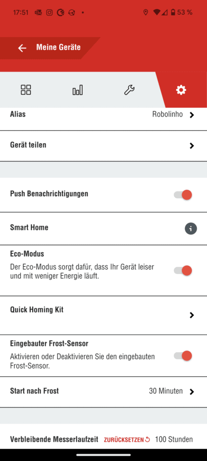 1. Die App funktioniert jetzt. Allerdings ist die Verarbeitung von Befehlen oft verzögert. Man bekommt eine Fehlermeldung, dass der Mähvorgang nicht gestartet werden konnte – der Mäher fährt dann aber trotzdem. Scheinbar ist deren Server ziemlich ausgelastet, sodass es hier zu Verzögerungen kommt. Das habe ich auch festgestellt, wenn man direkt mit der API arbeitet (in Home Assistant).