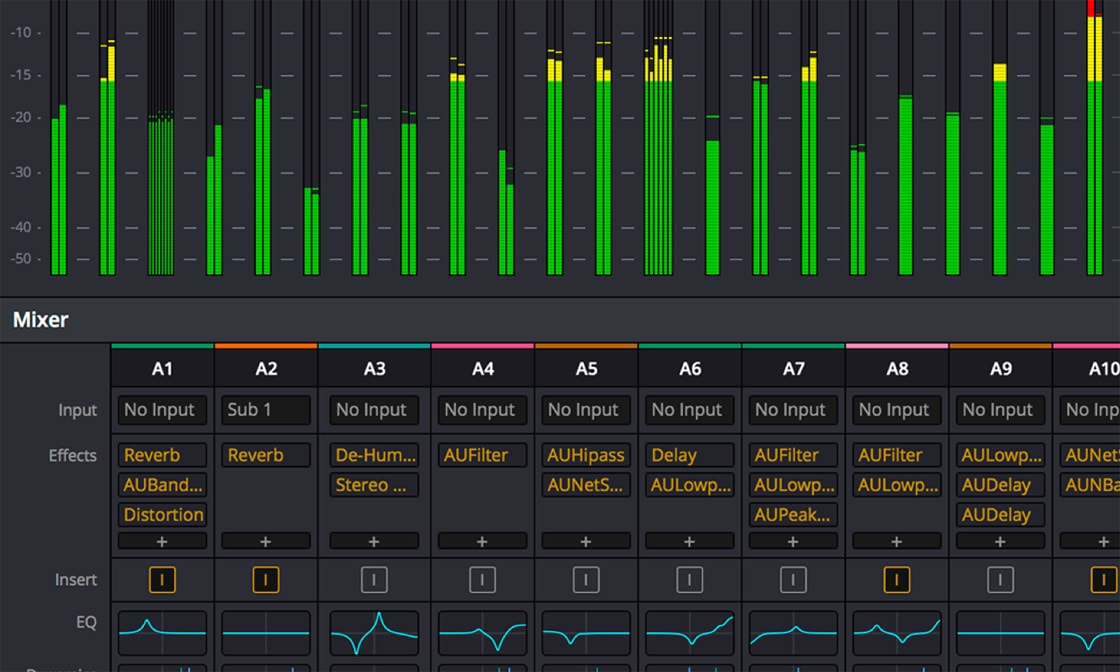 In DaVinci Resolve ist der Bereich der Audiobearbeitung extrem mächtig. Seit man hier das Know-How von Fairlight integriert hat, ist Resolve auch eine komplette Audio-Suite samt Mehrspuraufnahme, Effekten (Premiere Pro hatte noch nie einen vernünftigen Kompressor und Limiter) und Reparaturfunktionen. Damit ersetzt es für mich auch Adobe Audition komplett. Auch hier ist der große Vorteil, dass in das Schnittprogramm voll integriert ist – ganz ohne Zwischenexporte etc.