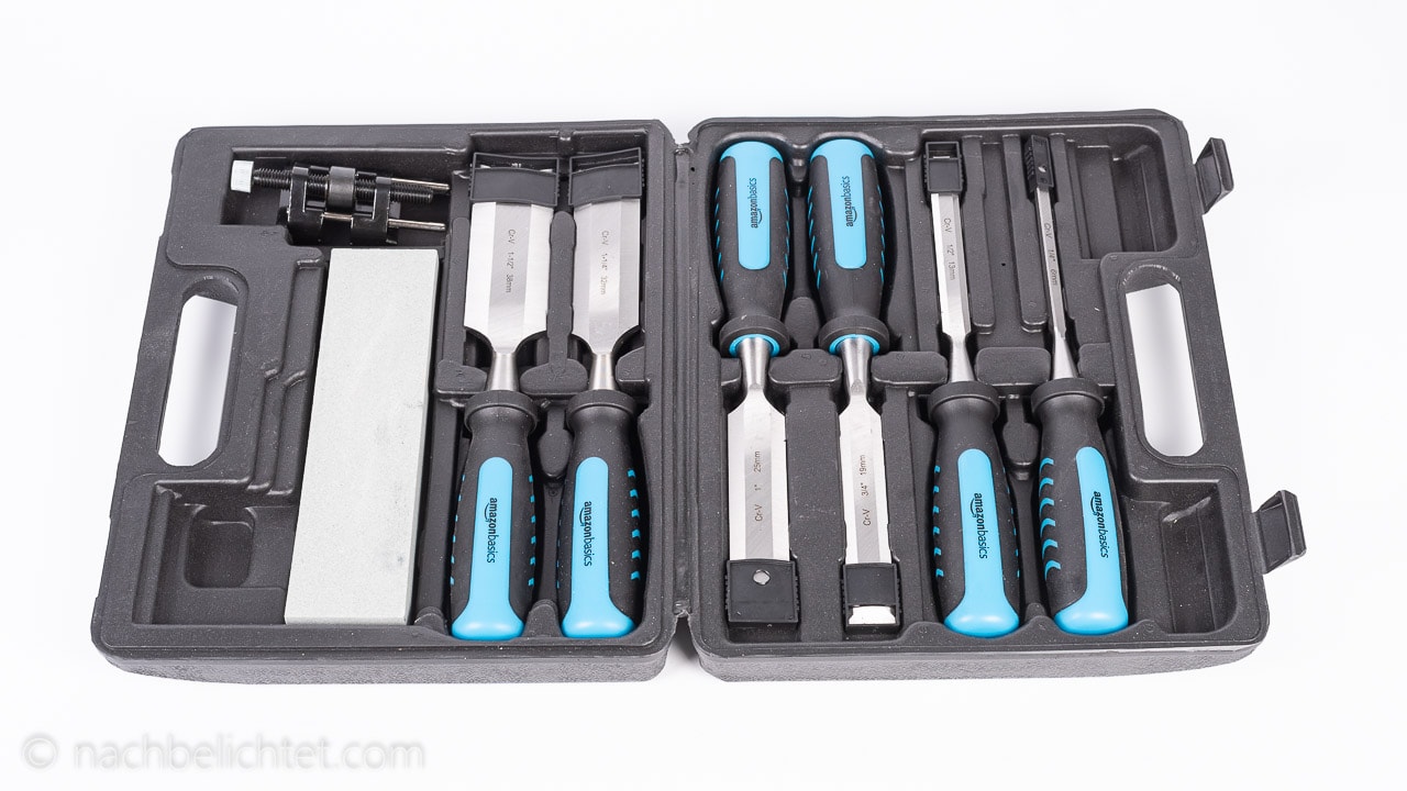Bei Amazon lachte mich ein Stemmeisen-Set von der Hausmarke Amazon Basics an. 6 Stechbeitel in den gängigsten Größen 6 mm, 13 mm, 19 mm 25 mm 32 mm und 38 mm kommen in einem Kunststoffkoffer samt Schleifführung und Schleifstein.