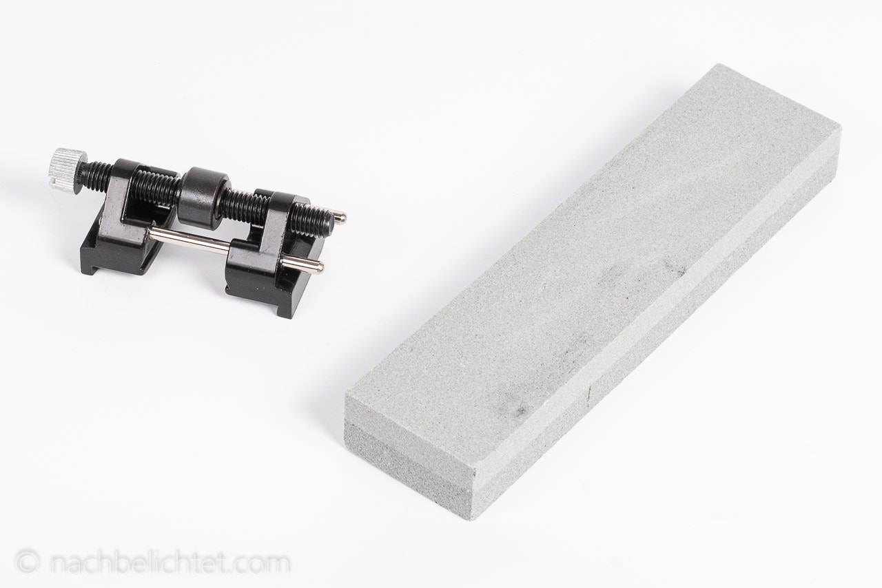 Die Schärfehilfe ist brauchbar und kostet alleine schon ca. 9 Euro. Der Abziehstein hingegen ist ziemlicher Schrott, da er krumm und wellig ist. Für grobe Arbeiten ist er sicher noch brauchbar. Für das präzise Schärfen von Stechbeiteln sollte man aber doch etwas mehr investieren. Ich nehme dazu die Schleifsteine, die ich mir vor Jahren zu meinen Küchenmessern angeschafft habe.