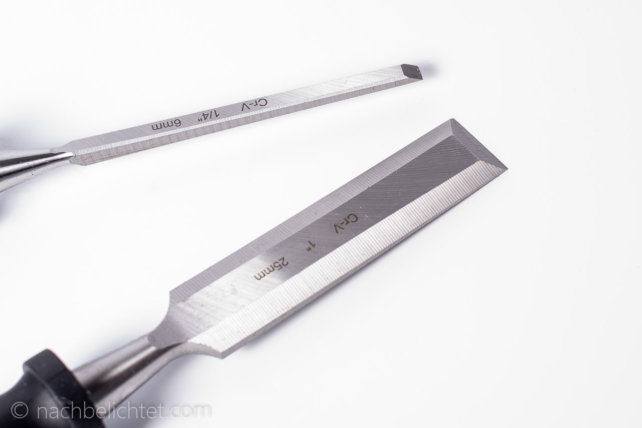 Hat man einen guten Schleifstein, lassen sich die Stechbeitel sehr gut nachschärfen. Alleine das ist aber schon eine Wissenschaft für sich. Für alle Heimwerker und Nicht-Vollzeit-Holzwürmer, sind die Stemmeisen von Amazon Basics ein Muss für die Werkstatt.