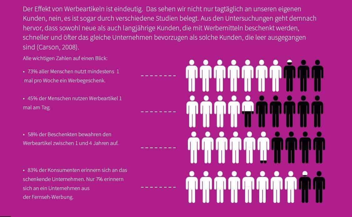 Wie wichtig Werbeartikel sind, zeigt eine Infografik. So heben viele Beschenkte einen Werbeartikel zwischen 1 und 4 Jahren auf und 83% der Konsumenten erinnern sich an das schenkende Unternehmen. (Quelle: Carson 2008).