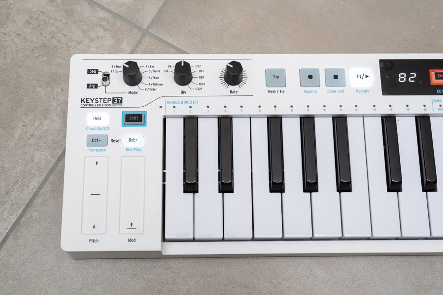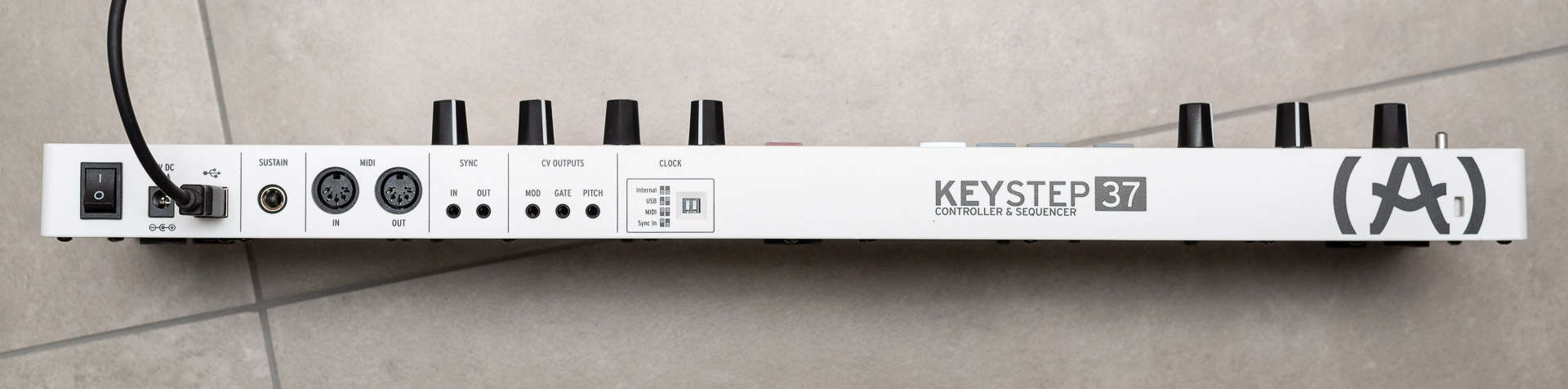 Überhaupt mach das KeyStep 37 einen sehr soliden und gut verarbeiteten Eindruck und es ist erstaunlich schwer. Eigentlich ist das KeyStep 37 eher für Anwender gemacht, die mit Modularsystemen arbeiten, denn es verfügt nicht nur über einen sehr leistungsfähigen Sequenzer und Arpeggiator, sondern auch über CV-Ausgänge und Sync Ein- und Ausgänge (über DIP-Schalter anpassbar). An einem 5-poligen MIDI-Ein und Ausgang wurde auch nicht gespart und natürlich kann man auch ein Sustain-Pedal anschließen. Es wird entweder über den USB-Anschluss mit Strom versorgt – wobei auch ein USB-Netzteil oder eine Powerbank möglich ist oder über ein optionales 12 Volt Netzteil.