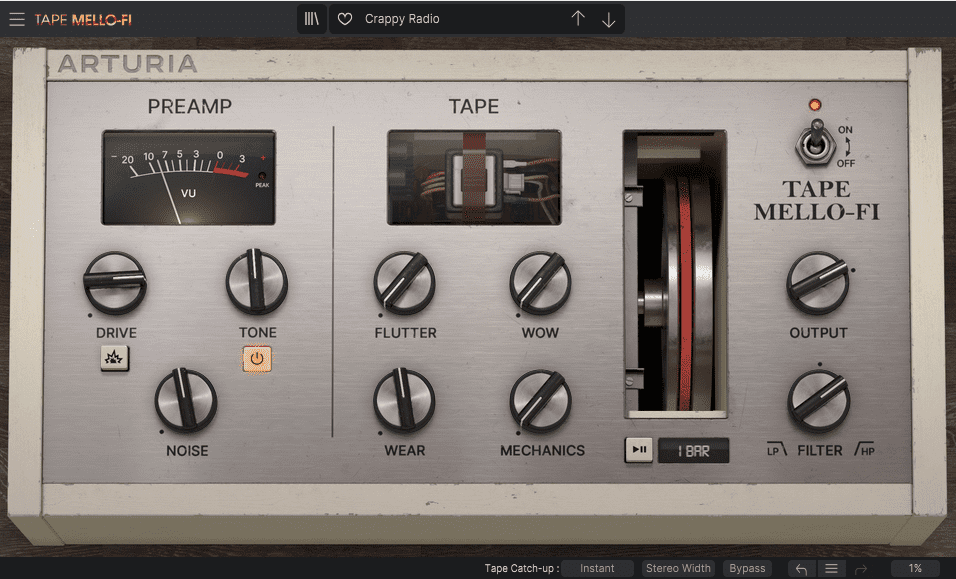 Und tatsächlich ist das extrem gut gelungen. So lassen sich nicht nur Verzerrungen geschmackvoll hinzufügen, sondern auch Wow- und Flutter (die typischen Gleichlaufschwankungen von alten Bandmaschinen), mechanische Geräusche, Bandrauschen und Abnutzungen hinzufügen. Mit dem Bandstopp, der mit der Geschwindigkeit der DAW synchron laufen kann, erzeugt man diesen typischen Soundeffekt, wenn ein Magnetband stoppt oder ausläuft. Außerdem gibt es noch einen Hoch- und Tiefpassfilter sowie eine Aussteuerungsanzeige.