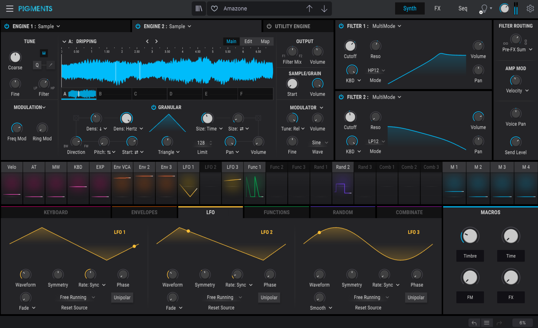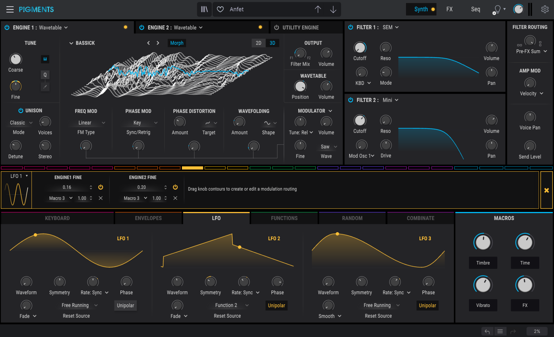 Pigments ist ein absolutes Powerhouse, da man von klassischer subtraktiver Synthese, über additive Synthese, FM, Sampler, Wavetable-Engine, Granularsynthese, die Utility-Engine, zwei Noise-Quellen und einen Sub-Oszillator in einer sehr übersichtlichen Oberfläche erhält, bei der praktisch alle Parameter auf einen Blick zu sehen sind.