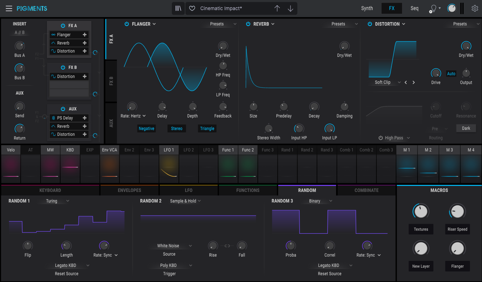 Pigments weitere Stärke ist sein Modulations-System, bei dem nahezu alles mit allem moduliert werden kann. Farbcodierung, animierte Signalformen und einfache Zuweisung, machen dieses mächtige Feature aber selbst für Einsteiger übersichtlich und verständlich. Selbst die Zuweisung mehrerer Modulationsquellen, was bei vielen anderen Synths rasch überaus komplex werden kann, ist sehr einfach möglich.