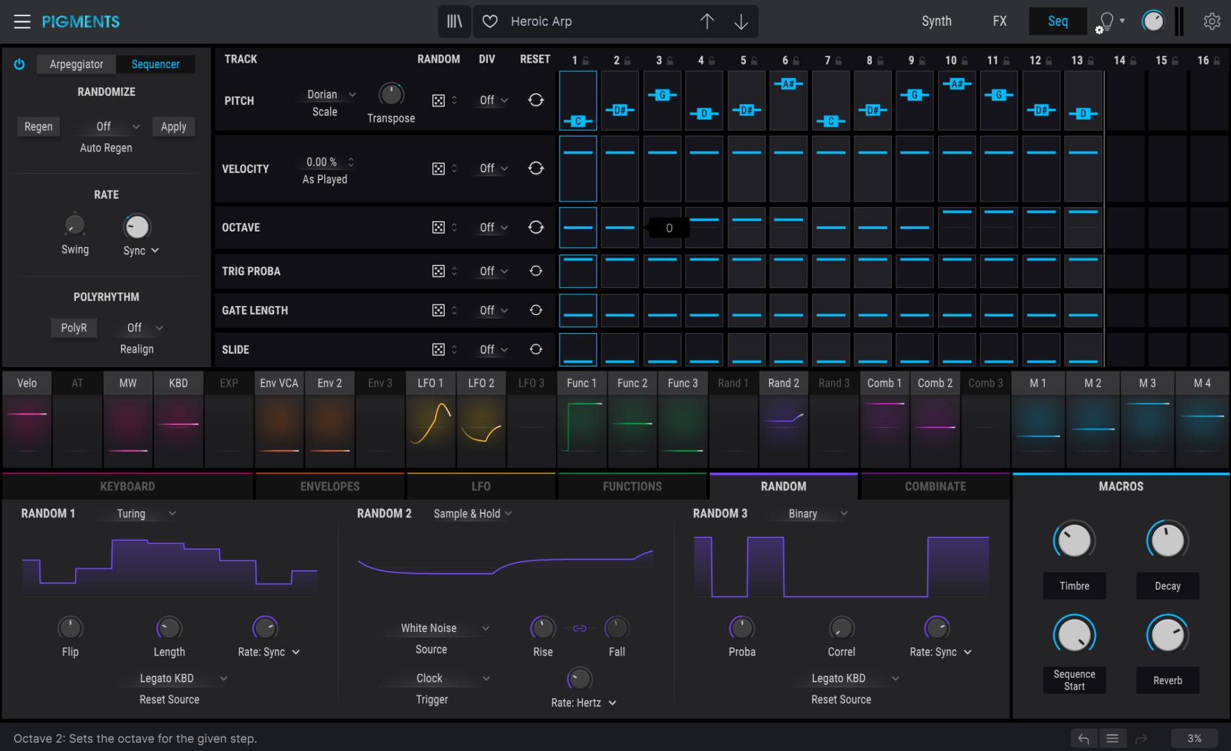 Auch der Sequenzer und Arpeggiator des Pigment ist einfach zu durchschauen und trotzdem leistungsfähig. Man kann Skalen wie Moll, Dur, Lydisch und die Tonart vorgeben. Wie beim Microfreak gibt es den Dice-Modus, der zufällige Muster erstellen kann. Gerade Sequenzer und Arpeggiator sind eine Quelle für Inspiration. Beide können übrigens auch als MIDI ausgegeben werden und damit andere Plugins oder externe Klangerzeuger steuern.