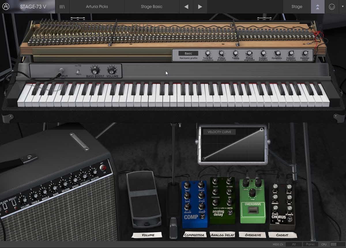 Insgesamt bekommt man in der neuen Version 5 zusätzliche Plugins zu den bereits 12 bekannten Tonerzeugern. Eine B-3 Hammond ist dabei, die Farsifa V als virtuelle Farsifa Compakt Deluxe Orgel, das Stage-73 V im Stil eines Fender Rhodes E-Pianos und Piano V, das wiederum aus nicht weniger als 9 verschiedenen Akustik-Pianos, angefangen vom Studio Upright bis zum großen Konzertflügel, besteht. Die Pianos greifen nicht auf riesige Sample-Bibliotheken zurück, sondern sind komplett modelliert. Darum kann man auch auf alle möglichen Parameter wie Mikrofonposition, Saiten, Hämmer und den Klangkörper selbst zugreifen und diese nach Belieben anpassen und verbiegen.