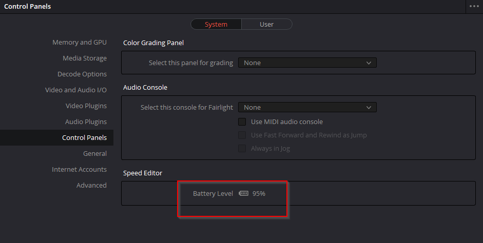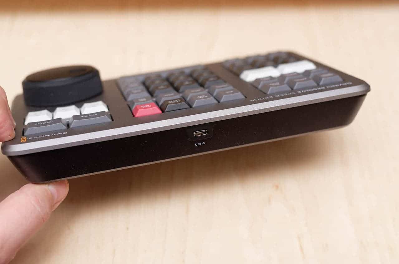 Der Speed Editor hat einen eingebauten Akku und kann per Bluetooth drahtlos betrieben werden. Aufgeladen wird er über einen USB-C-Anschluss, der auch zur Verbindung mit dem Rechner per Kabel genutzt werden kann. Der Ladestand wird nur in Resolve unter Preferences->Control Panel angezeigt.