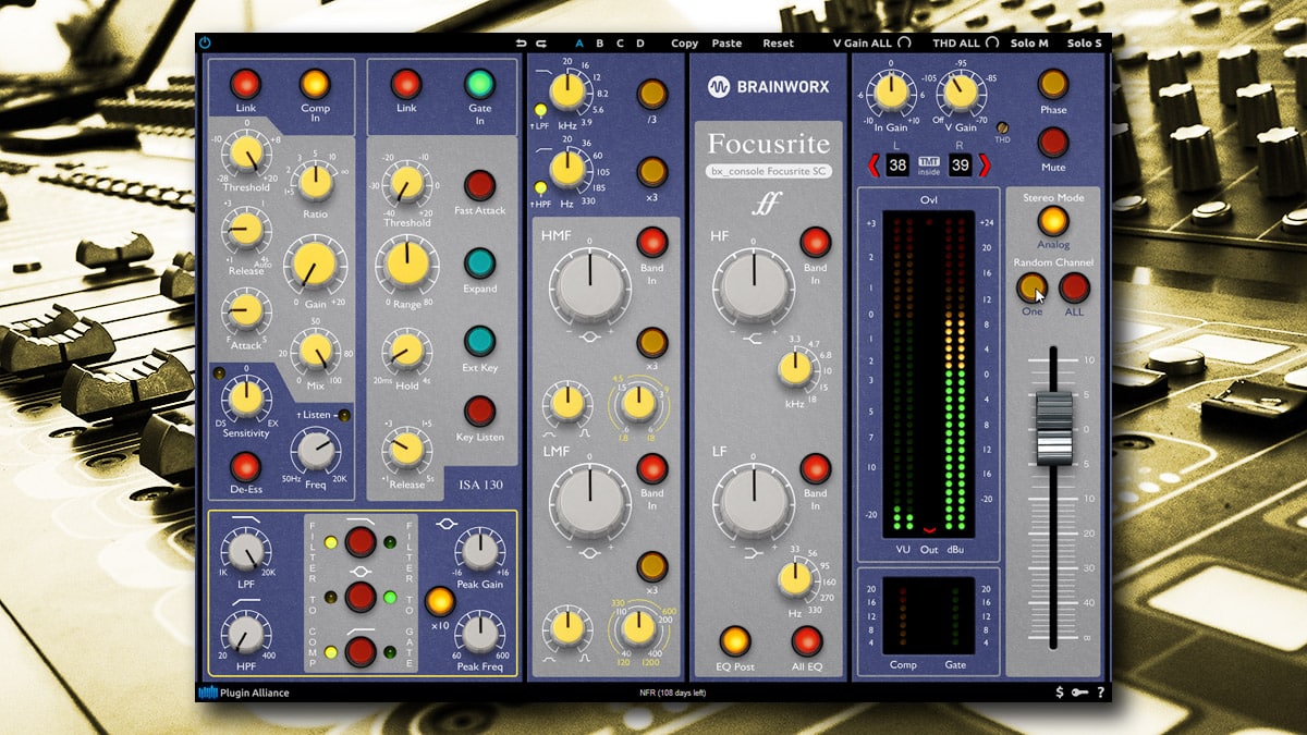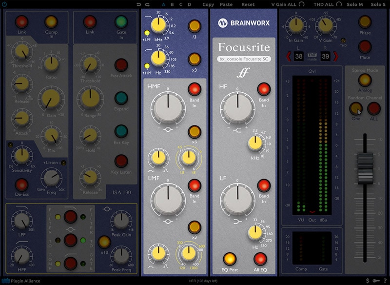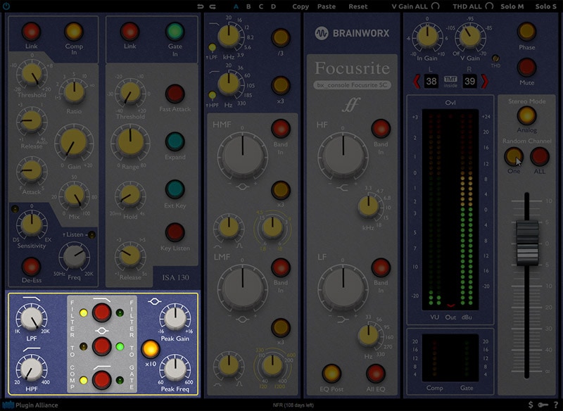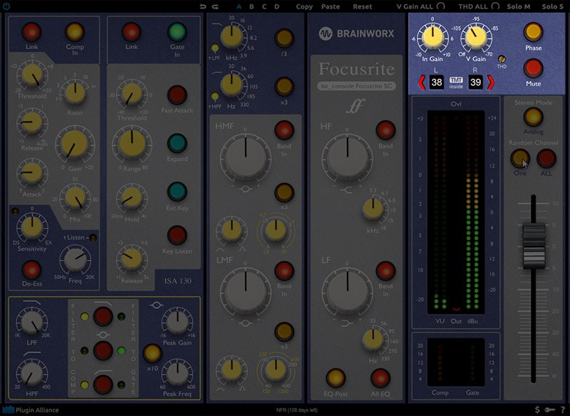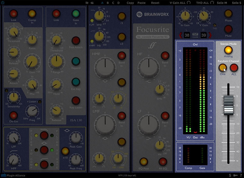 Weil wir gerade bei TMT sind: Der simulierte Kanalzug jeder Instanz des Focusrite Plugins, kann für linken und rechten Kanals getrennt ausgewählt werden. Alle TMT-Kanäle lassen sich auch zufällig auswählen.
