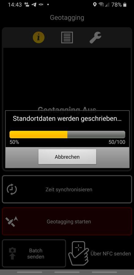Ist man mit seiner Fototour fertig, verbindet man die App wieder mit der Kamera. Nun wird eine Datei mit den Ortsdaten vom Smartphone zur Kamera gesendet und die Positionsdaten werden passend zum Zeitstempel in die Bilder auf der Speicherkarte geschrieben.