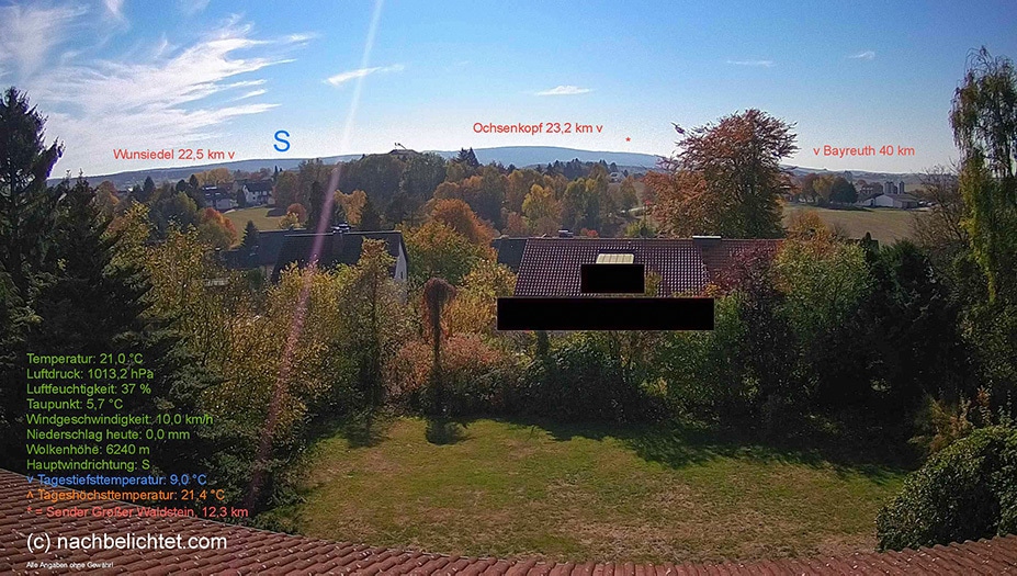 Die neue Kamera ist nun am Ausleger unserer Sat-Anlage befestigt, wo auch schon die beiden Wetterstationen Platz gefunden haben. Hier ergibt sich eine sehr viel interessantere Ansicht, die weit in das Fichtelgebirge schaut. Zudem gibt es nun einige Einblendungen zur Orientierung und die Wetterdaten sind nach rechts unten gewandert.