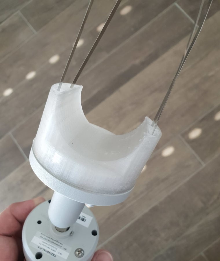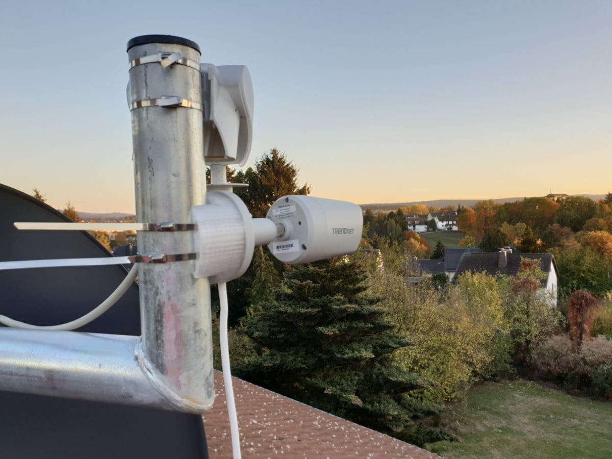 Die erste Version der Webcam war oberhalb unseres Balkons montiert und lieferte schon eine ganz nette Ansicht. Von unserem Dach aus hat man jedoch noch eine sehr viel bessere Rundumsicht über Schwarzenbach/Saale und das Fichtelgebirge. Also habe ich mir eine weitere IP-Kamera besorgt und eine Masthalterung konstruiert, die ich dann mit meinem 3D-Drucker und PETG-Material ausgedruckt habe. PETG deshalb, weil es sehr viel zäher und witterungsbeständiger als ABS ist. An das neue Material musste ich mich erst ein bisschen herantasten – mein Wanhao Duplicator 6 hatte dann aber keine Probleme damit. Ich druckte die Halterung übrigens mit 245 °C.