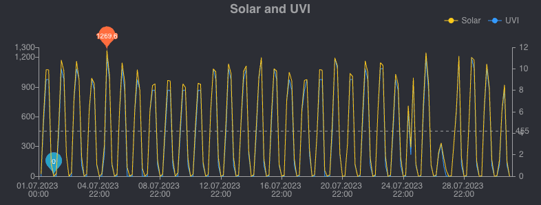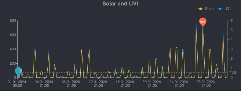 Den Unterschied bei der Sonnenstrahlung kann man schön an den Werten unserer Ecowitt Wittboy Wetterstation erkennen. Hier ein Vergleich zwischen Januar 2024 und Juli 2023. Die Diagramme zeigen die Sonnenstrahlung in Watt/m2: