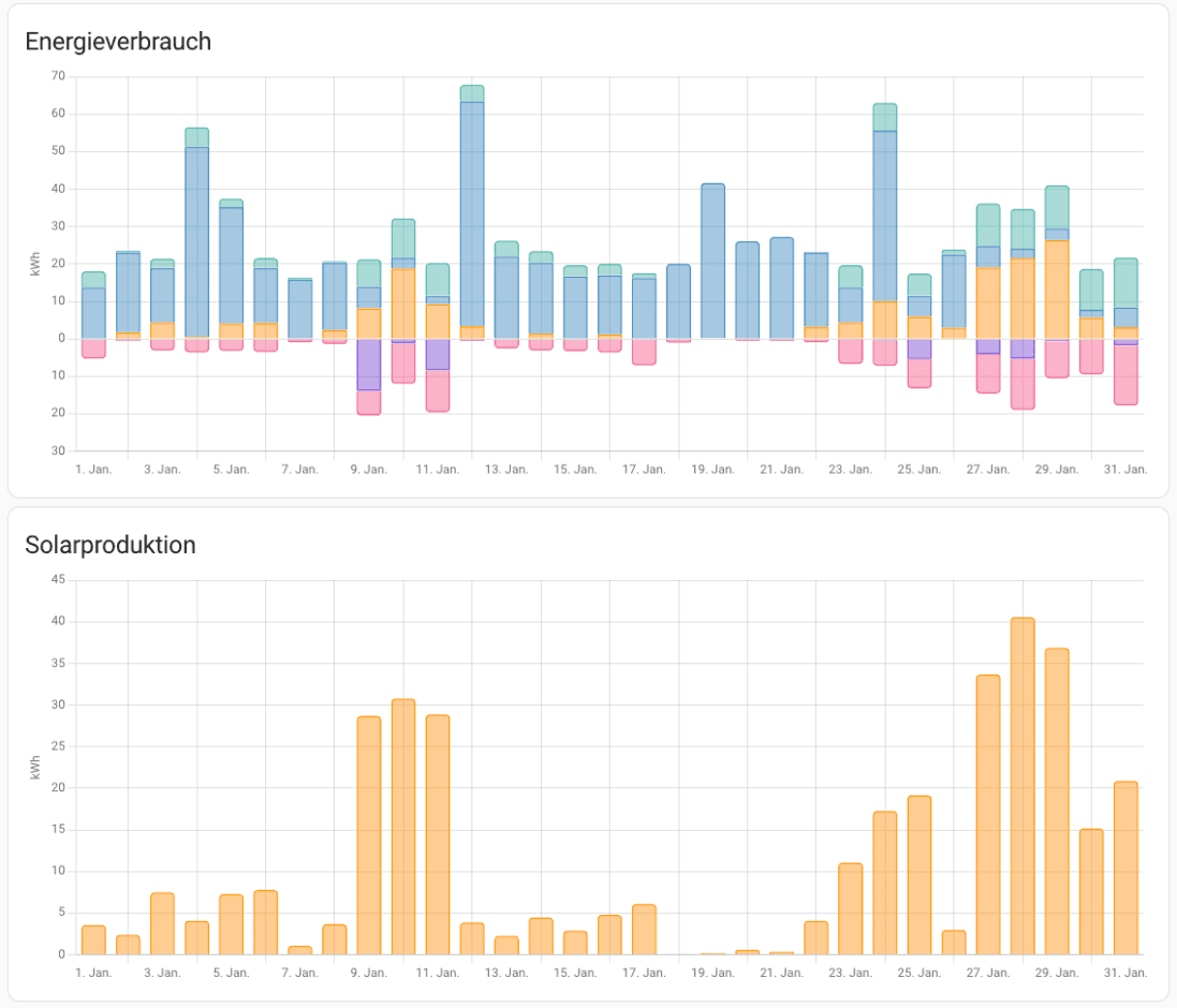 - 880 kWh Strom wurden verbraucht, wobei 235 kWh auf das Laden des E-Autos entfielen (das im Winter auch einen höheren Verbrauch hat).