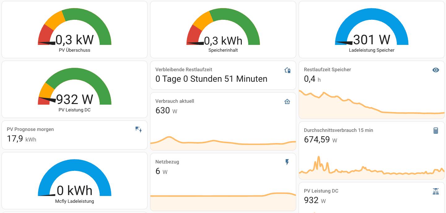 Selbst bei bedecktem Himmel hat man gegen 8:30 schon 600 Watt PV-Leistung. Das bedeutet, dass wir zu dieser Zeit unsere Grundlast inkl. Homeoffice bereits komplett mit PV decken können. Gegen 9 Uhr lädt dann der erste PV-Überschuss schon wieder den Speicher.