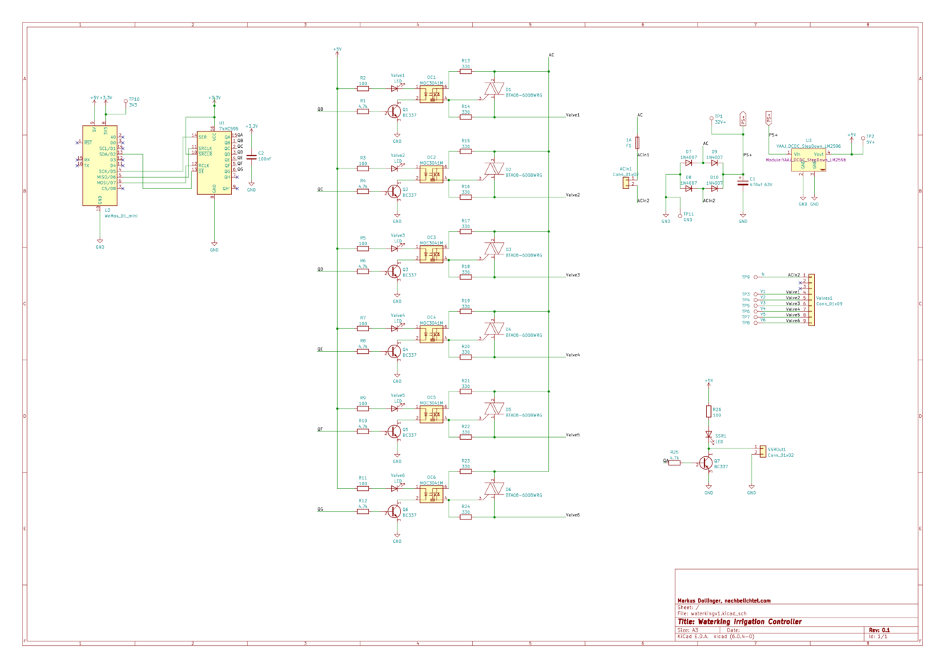 Ich habe mich bei meinem DIY-Controller, den ich Waterking getauft habe, für Triacs vom Typ BTA08-600B entschieden, die über einen MOC3041 Optokoppler angesteuert werden, der auch gleich einen Nulldurchgang-Triac-Treiber enthält. Rechnet man noch 5 Widerstände, einen NPN-Transistor und eine LED dazu, kostet ein Kanal nicht einmal einen Euro und man wird nie Kontaktprobleme haben. Die LEDs zeigen Hardware-seitig an, ob ein Ventil offen ist und der Optokoppler angesteuert wird.