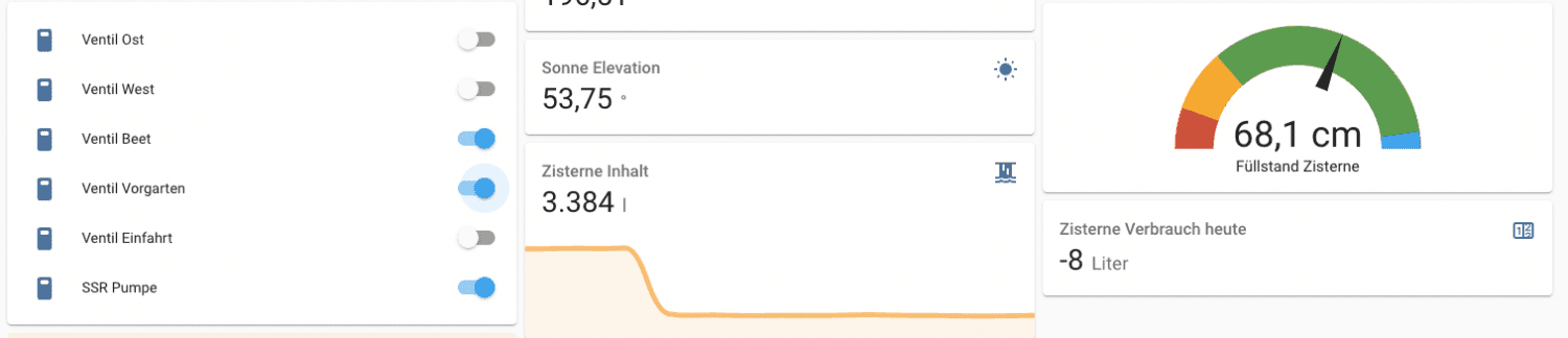 Die Füllstandsmessung der Zisterne ist übrigens auch ein hervorragender Sensor, was Niederschlagsmengen angeht, bekommt er doch den Niederschlag von 75 qm Dachfläche. Bei niedrigem Wasserstand in der Zisterne kann man auch die Bewässerungszeiten verkürzen usw.