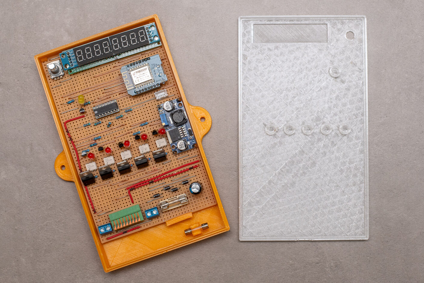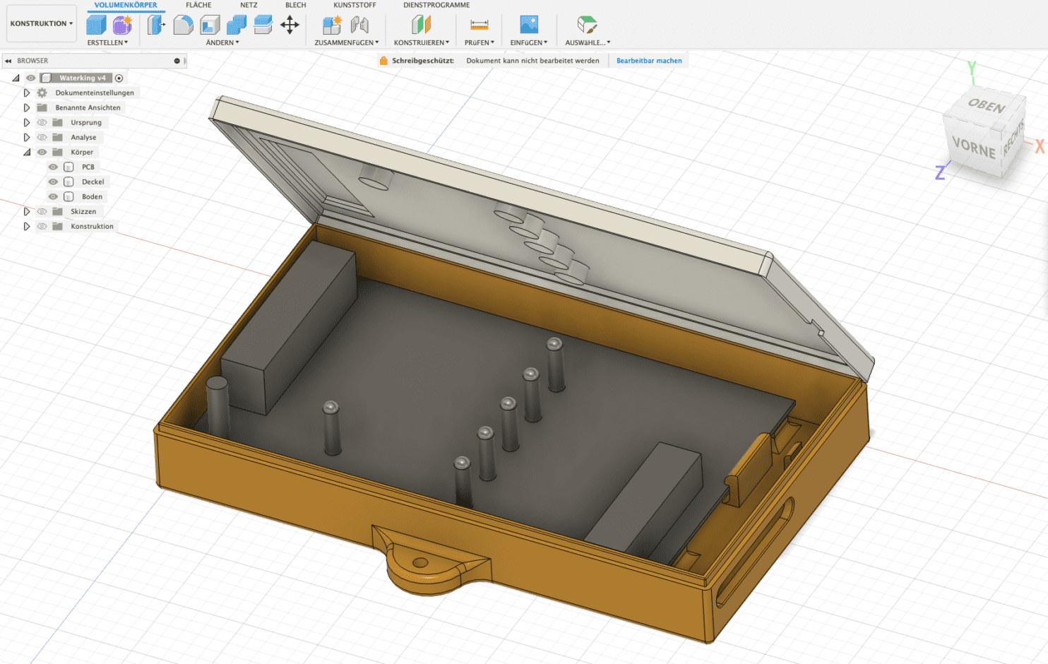 Das ganze Gehäuse ist schraubenlos verschließbar und auch die Platine wird nur von Schnappverschlüssen gehalten. Bei einer handgefertigten Platine ist die Konstruktion eines Gehäuses mit Deckel nicht ganz trivial, klappte aber beim ersten Versuch und Druck.