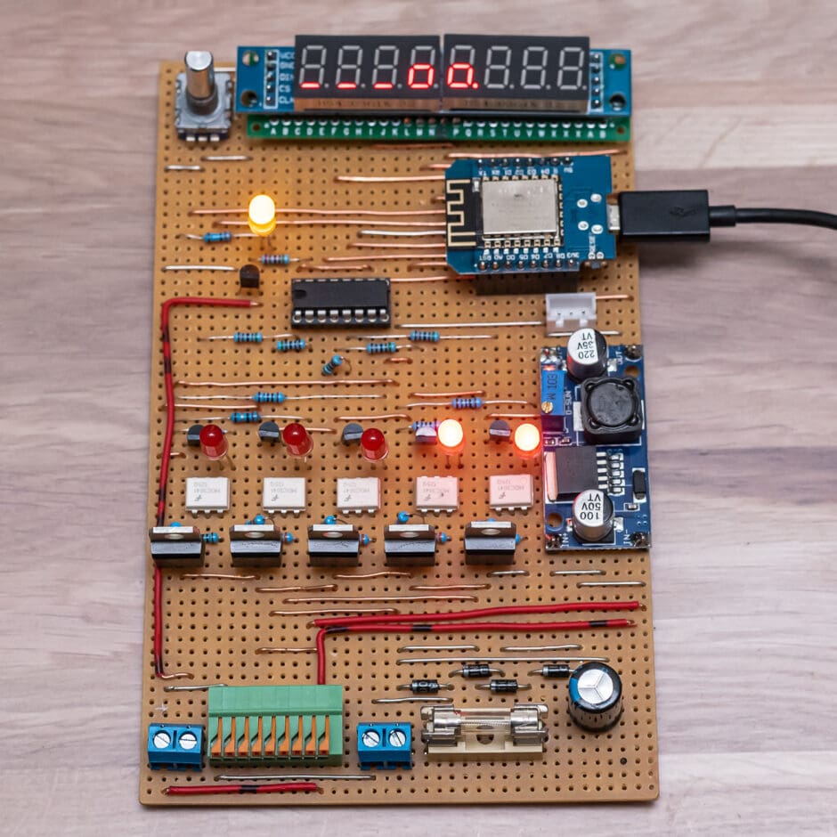Ursprünglich sollte mein Controller „dumm“ bleiben, also nur die Triac-Ausgänge per Home Assistant schaltbar machen. Wenn man aber schon einen Mikrocontroller hat, kann man ja auch gleich noch ein paar Funktionen extra einbauen. So schalten die Ventile nach einer konfigurierbaren Zeit (10 Minuten) ab. Ist kein Ventil mehr aktiv, wird auch die Pumpe deaktiviert. Sollte die WLAN-Verbindung während der Bewässerung verloren gehen oder Home Assistant einen Bug haben, schalten Ventile und die Pumpe automatisch und autonom ab. Aufgebaut habe ich alles auf einer Streifenrasterplatine. Ich bin „Team Streifenraster“ – mir gefällt das Herumgekleckse mit Lötzinn auf den Perfboards einfach nicht.
