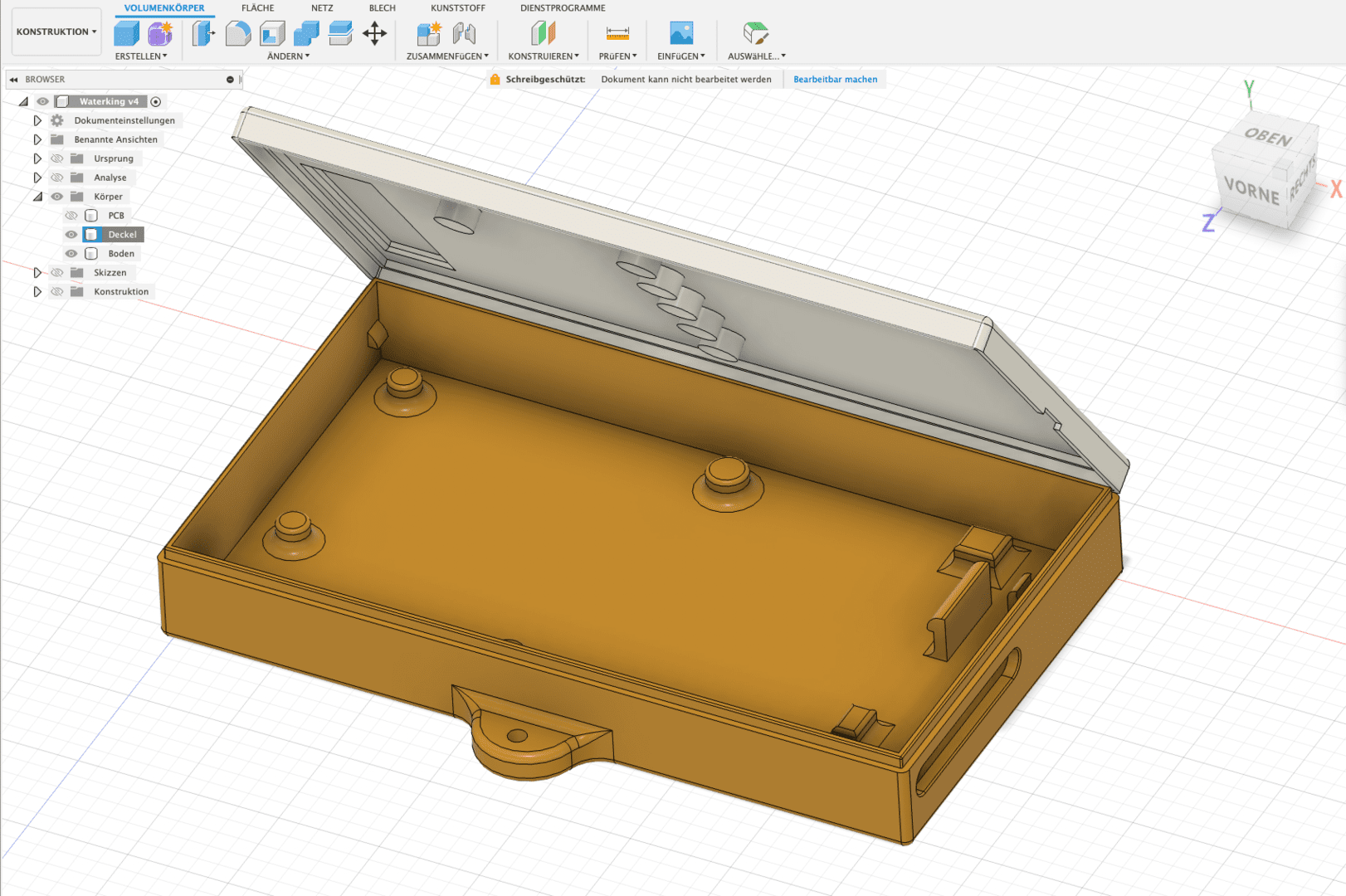 Das ganze Gehäuse ist schraubenlos verschließbar und auch die Platine wird nur von Schnappverschlüssen gehalten. Bei einer handgefertigten Platine ist die Konstruktion eines Gehäuses mit Deckel nicht ganz trivial, klappte aber beim ersten Versuch und Druck.