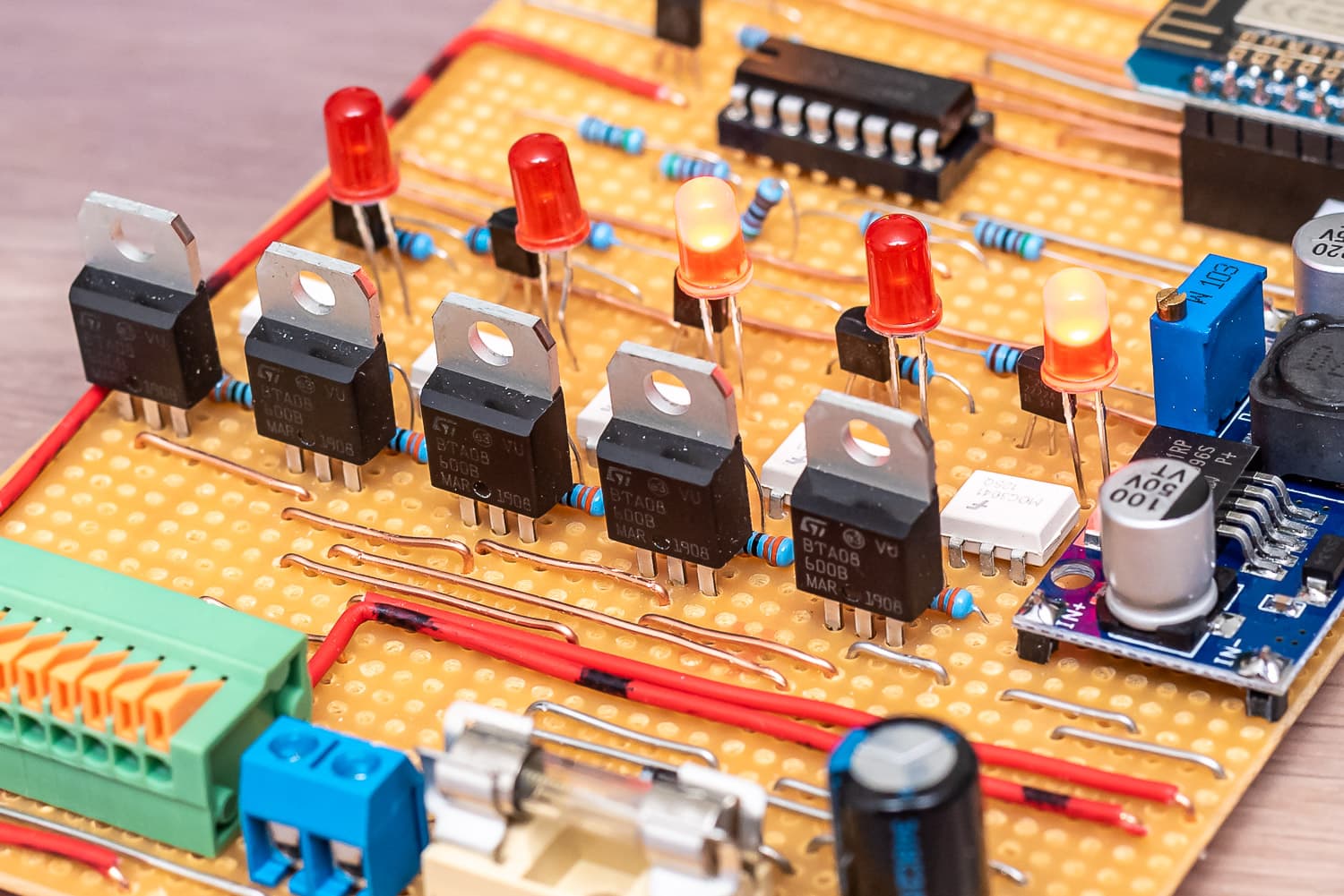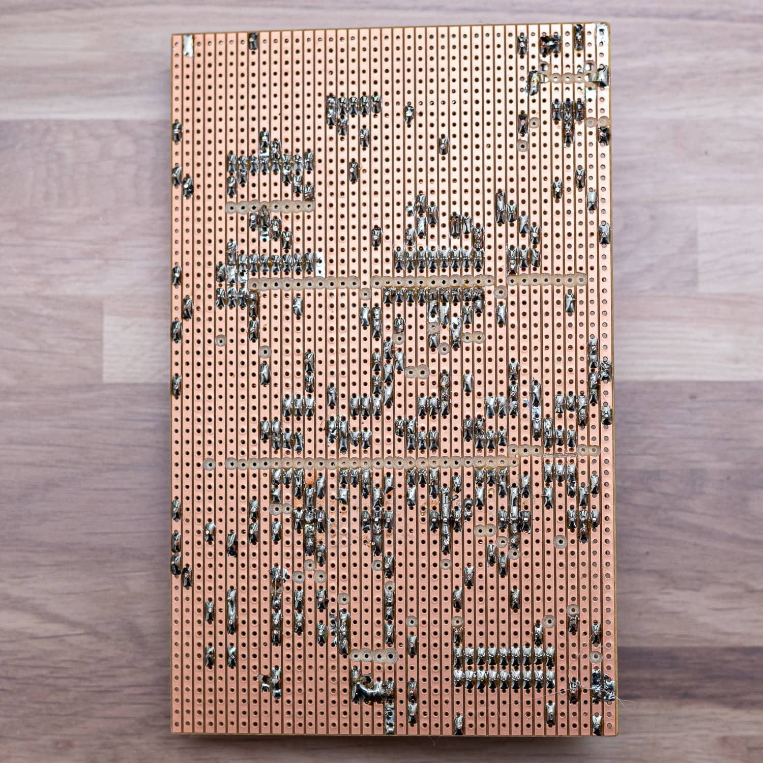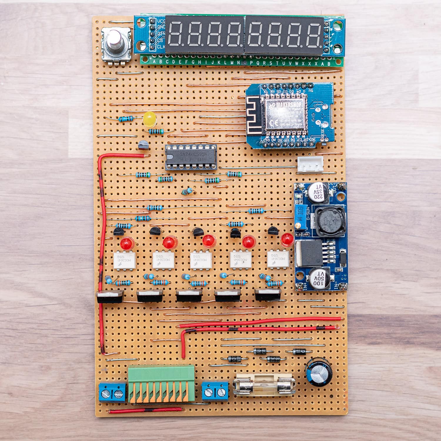 Ursprünglich sollte mein Controller „dumm“ bleiben, also nur die Triac-Ausgänge per Home Assistant schaltbar machen. Wenn man aber schon einen Mikrocontroller hat, kann man ja auch gleich noch ein paar Funktionen extra einbauen. So schalten die Ventile nach einer konfigurierbaren Zeit (10 Minuten) ab. Ist kein Ventil mehr aktiv, wird auch die Pumpe deaktiviert. Sollte die WLAN-Verbindung während der Bewässerung verloren gehen oder Home Assistant einen Bug haben, schalten Ventile und die Pumpe automatisch und autonom ab. Aufgebaut habe ich alles auf einer Streifenrasterplatine. Ich bin „Team Streifenraster“ – mir gefällt das Herumgekleckse mit Lötzinn auf den Perfboards einfach nicht.