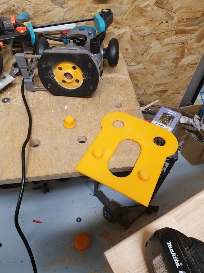 Eine etwas anspruchsvollere Aufgabe waren die 20 mm Löcher für den Spanntisch. Diese müssen ausreichend präzise sein, damit die Spannvorrichtung auch ihren Zweck erfüllen kann. Nach einigen Überlegungen habe ich mich dazu entschlossen, die Löcher zu Fräsen. Um das genau, wiederholbar und effizient zu erledigen, habe ich eine Frässchablone und eine Kopierhülse für die Makita 0700 (Katsu) Oberfräse konstruiert und mit meinem 3D-Drucker ausgedruckt.