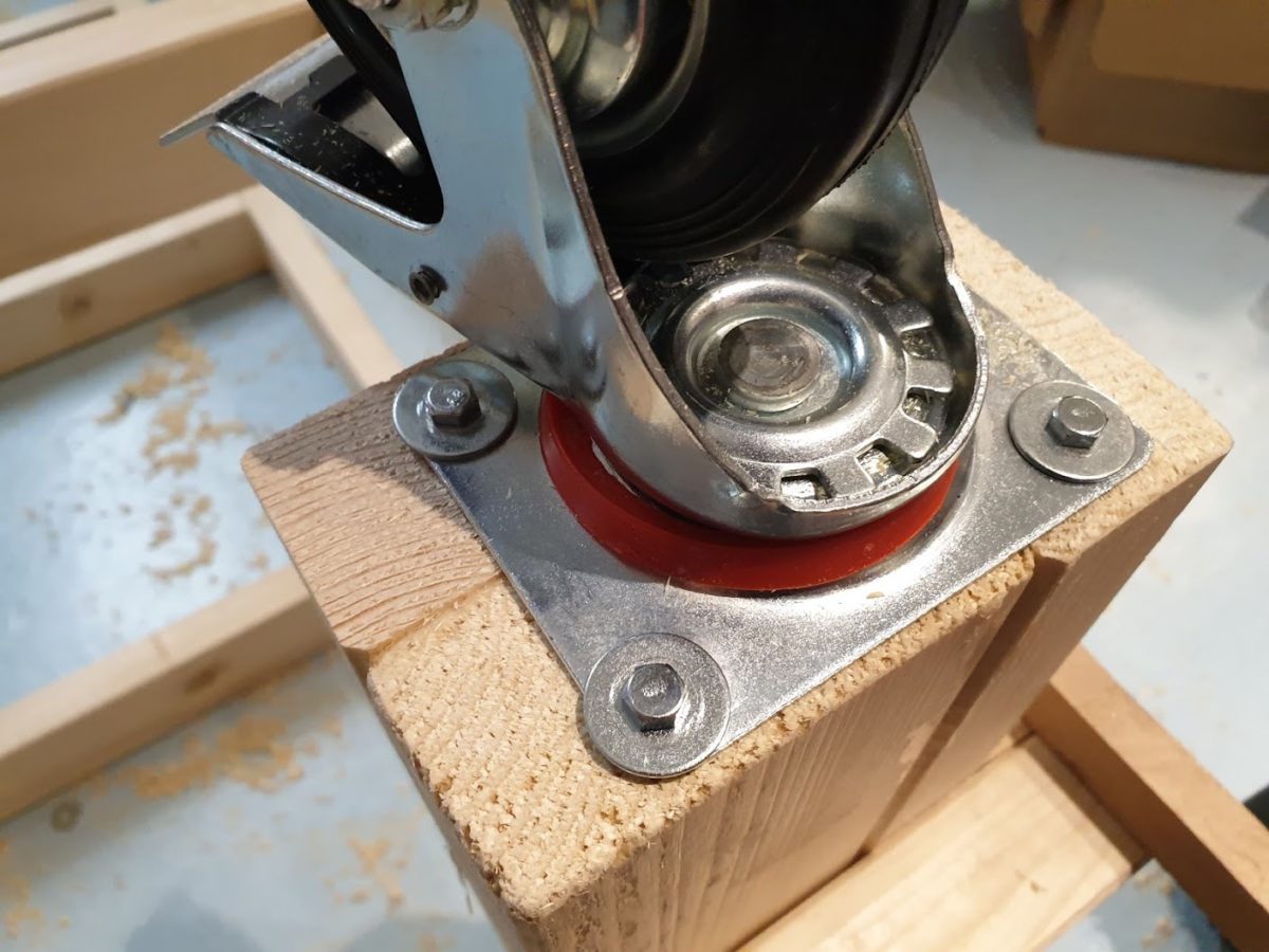 Als Leim kommt D3 Holzleim von Uhu zum Einsatz. Nach gut 2 Stunden Press- und Abtrockenzeit, erhält man so eine einfach zu bauende, aber trotzdem bombenfeste Verbindung und damit sehr stabile Tischbeine. Im unteren Teil der Beine wird ein 120 mm langes Stück Holz eingesetzt, damit die Lenkrollen voll aufliegend angeschraubt werden können.