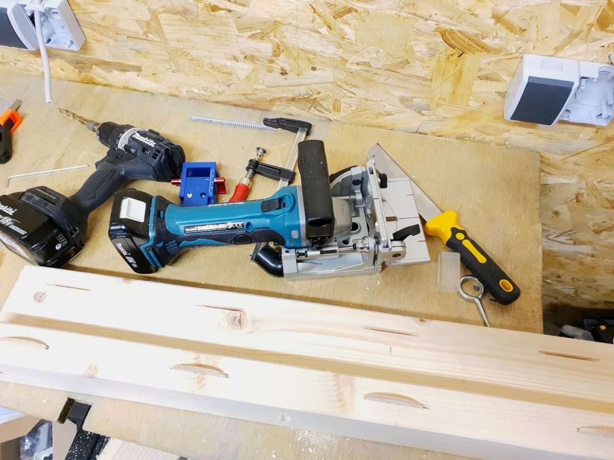 Die Beine der Werkbank bestehen aus zwei 670 mm langen Hölzern, die mit Flachdübeln stumpf über Eck verleimt wurden. Außerdem werden sie verdeckt verschraubt. Ich nutze dazu die Makita DPJ 180 Z Akku-Flachdübelfräse und ein günstiges Jig-Set von Amazon.