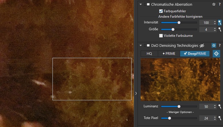 Die bisherige Prime Einstellung beim Entrauschen war der von Lightroom schon lange überlegen. Mit DeepPrime fällt einem schon mal die Kinnlade runter, denn die Ergebnisse kann ich auch nicht in Capture One und schon gar nicht in Lightroom annähernd reproduzieren. Dabei gibt sich DeepPrime z. B. auch bei Sternenhimmeln keine Blöße. Viele Entrauschungsalgorithmen interpretieren kleine Sterne gerne als Pixelfehler oder eben Bildrauschen und rechnen sie heraus. DxOs DeepPrime lässt sie hingegen unversehrt. Dabei geht die Vorschau von DeepPrime auch noch deutlich schneller zur Sache, als das bisherige Prime, was aber noch immer genutzt werden kann.