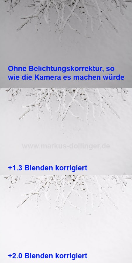Dadurch ist der Schnee grau statt weiß und alles andere viel zu dunkel. Mit der Belichtungskompensation eurer Kamera könnt ihr da entgegen wirken, indem ihr einfach +1 bis +2 Blendenstufen einstellt. Die beste Einstellung hängt dabei von eurer Kamera ab – manche neigen ohnehin etwas zur Überbelichtung, dann muss nicht so viel kompensiert werden, aber in diesem Bereich sollte es funktionieren.