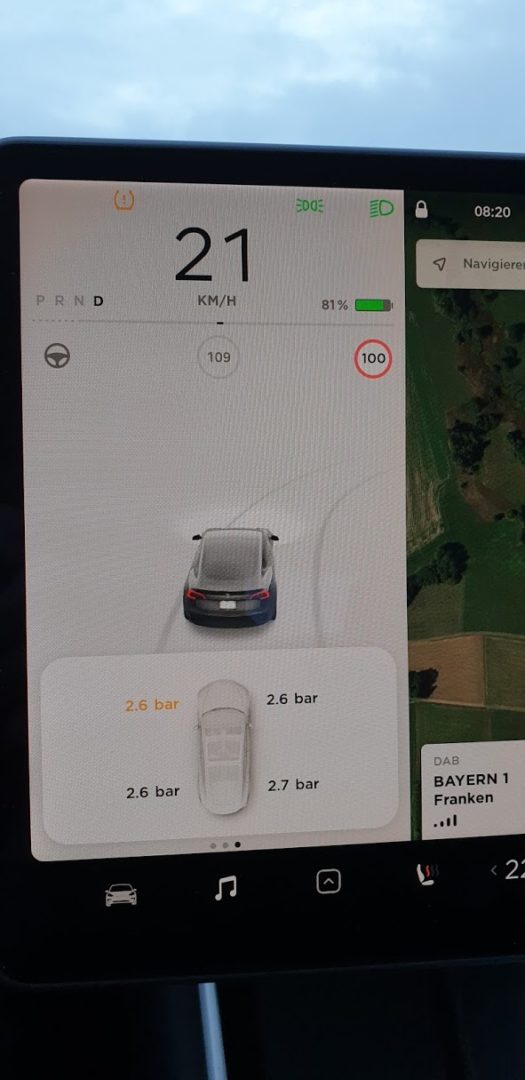Beim Reifendruck ist der Tesla etwas zickig. Beim Wechsel auf die Winterräder hat der Reifen-Dealer meines Vertrauens 2,7 bar eingefüllt. Bei Kälte sinkt das jedoch ab und ab 2,6 bar Reifendruck meldet er ein Problem mit den Rädern. Das verunsichert zunächst etwas, weil 2,6 bar erst einmal nicht als extrem niedrig empfunden werden und man ein anderes Problem vermutet. Tatsächlich sollte man 2,9 oder 3,0 bar einfüllen, denn damit hat man auch bei niedrigen Temperaturen und kalten Reifen kein Problem mehr.