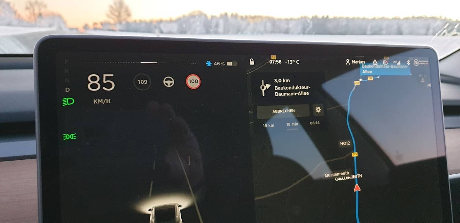 Die Reichweitenanzeige „erholt“ sich jedoch, sobald der Akku warm ist und zeigt im Laufe der Zeit dann wieder größere Reichweiten an. Wenn der Tesla lange in der Kälte stand, habe ich 5 Minuten vor Abfahrt per Tesla-App die Klima-Anlage (und Sitzheizung) gestartet (Vorklimatisierung). Damit taut nicht nur die Frontscheibe ab und es ist bei der Abfahrt kuschelig war, auch der Akku wird vorgewärmt. Damit steht die Rekuperation früher zur Verfügung und insgesamt hat man – meiner Erfahrung nach – auch keinen höheren Stromverbrauch, als wenn man „kalt“ losfährt. Es ist eben auch deutlich komfortabler.