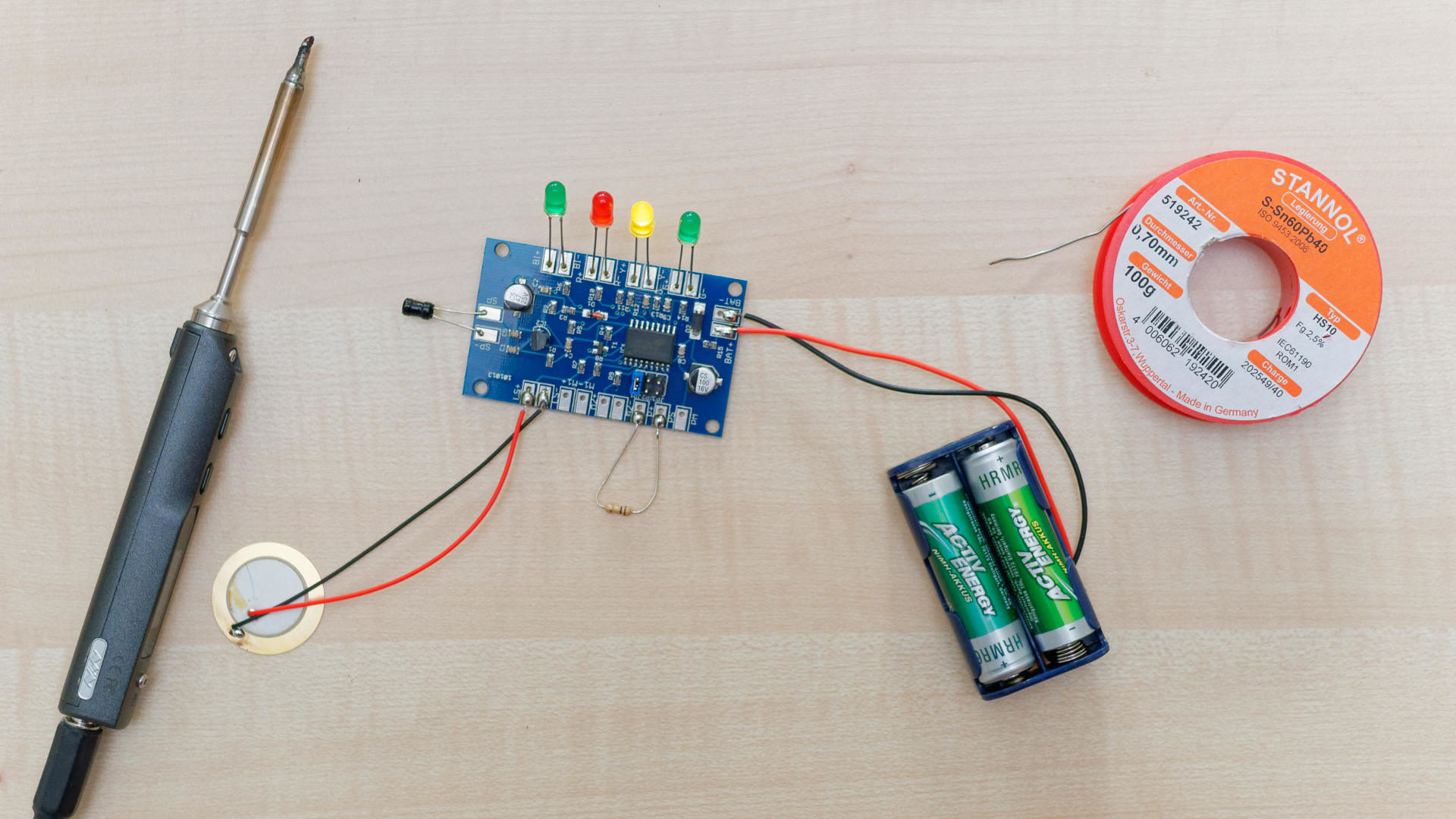 Das Gerät ist bereits zum größten Teil fertig, was angesichts der SMD-Bauteile auch eine gute Entscheidung ist. So ist nur etwas Löterfahrung notwendig, um ein weiteres IC, Piezo-Lautsprecher, eine Stiftleiste und andere periphere Bauteile zu komplettieren, was nur wenige Minuten in Anspruch nimmt.