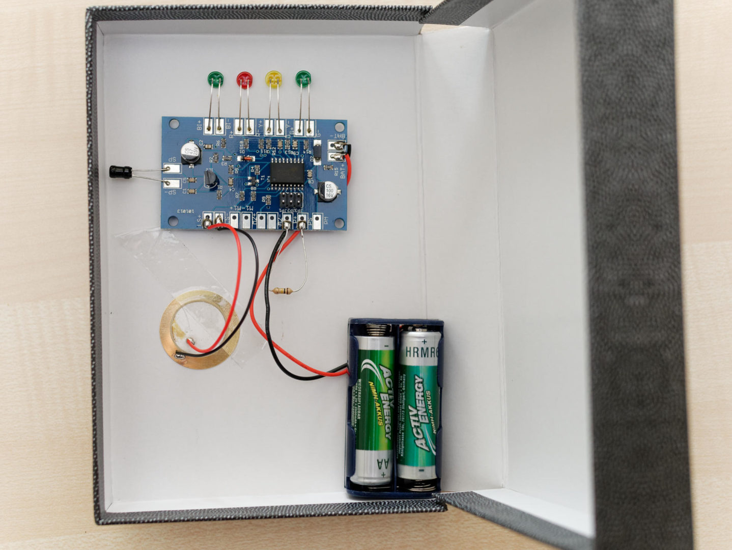 Der fertige Gewitterwarner kann dann in die Papp-Box eingebaut werden. Der Lautsprecher wird mit einem Streifen Klebefilm auf dem Karton geklebt, der gleichzeitig als Membran dient. Hat man zwei AA-Batterien eingelegt, beginnt die Schaltung mit der Kalibrierung, was das Blinken der ersten grünen LED anzeigt und ist nach 2 Sekunden abgeschlossen. Die zeigt gleichzeitig die korrekte Funktion des Geräts an.