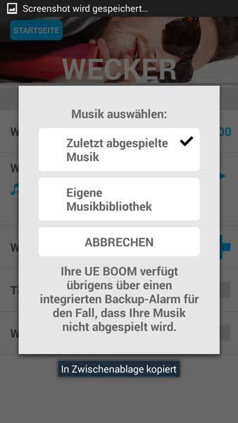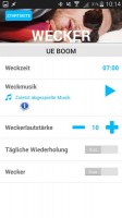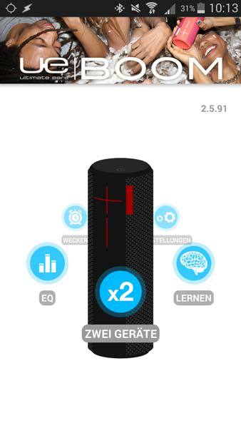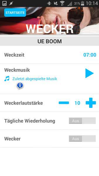 Den UE BOOM kann man über eine kostenlose App für iOS und Android bedienen. Darüber lässt sich z. B. der Akkustand anzeigen und die Systemsprache einstellen. Viel interessanter ist jedoch die Equalizer-Funktion für individuelle Klangeinstellungen und der Weckmodus. Der BOOM kann als Wecker eingesetzt werden, in dem man eine Weckzeit, die gewünschte Lautstärke und Musik einstellt. Der Lautsprecher aktiviert sich automatisch eine Minute vor der eingestellten Weckzeit und beginnt entweder mit der Wiedergaben der zuletzt gespielten Musik oder der Musikbibliothek auf dem Mobilgerät. Dank der sehr fein einstellbaren Lautstärke ist die Wiedergabe auch wirklich dezent und angenehm.