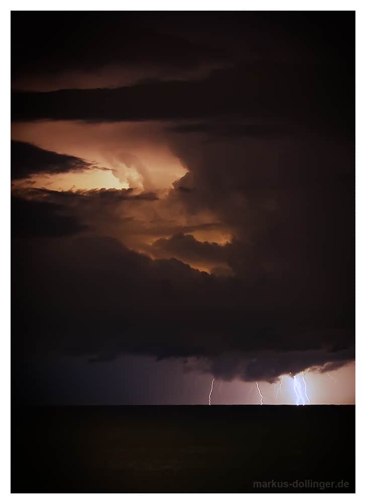 Damit kann man ab der „Blauen Stunde“ recht gut auf Gewitterjagt gehen. Diese Grundeinstellung ist aber noch von vielen anderen Faktoren abhängig: Bei Vollmond kann man eine etwas kleinere Blende nehmen, ebenso bei starkem Umgebungslicht, wie es Straßenlaternen etc. erzeugen.