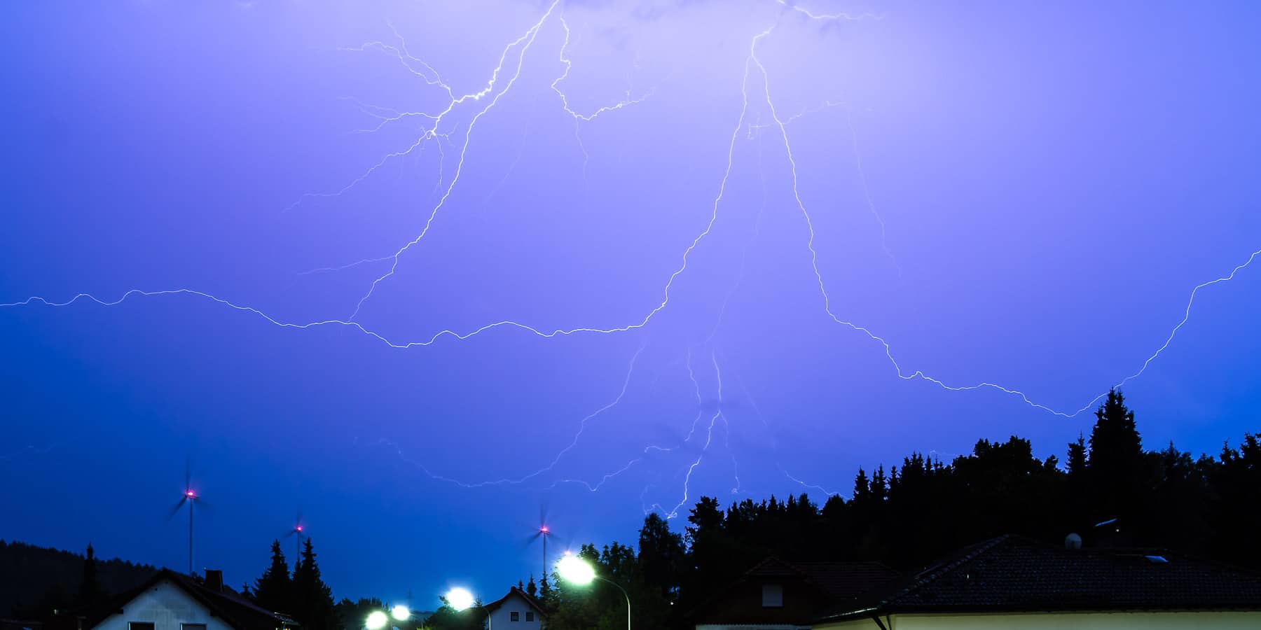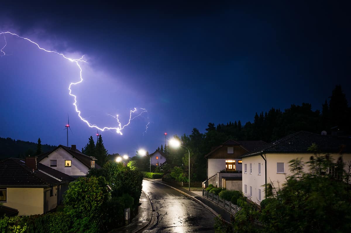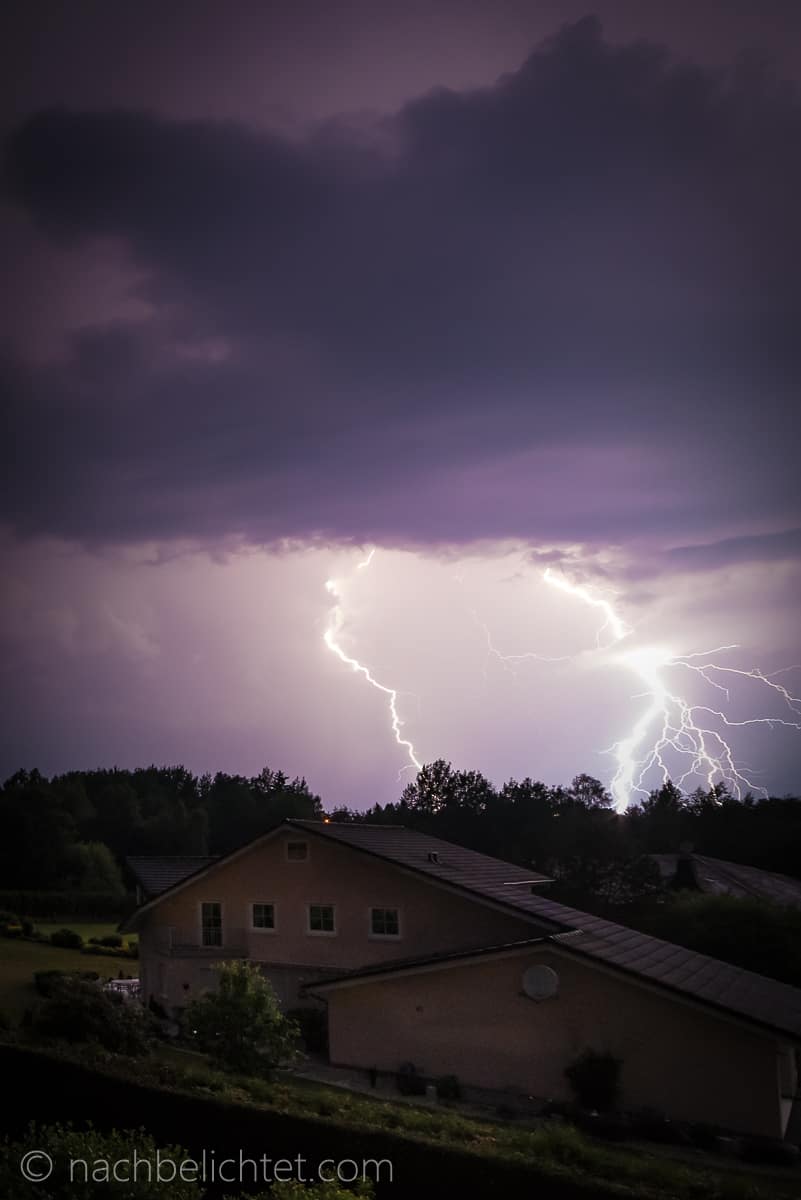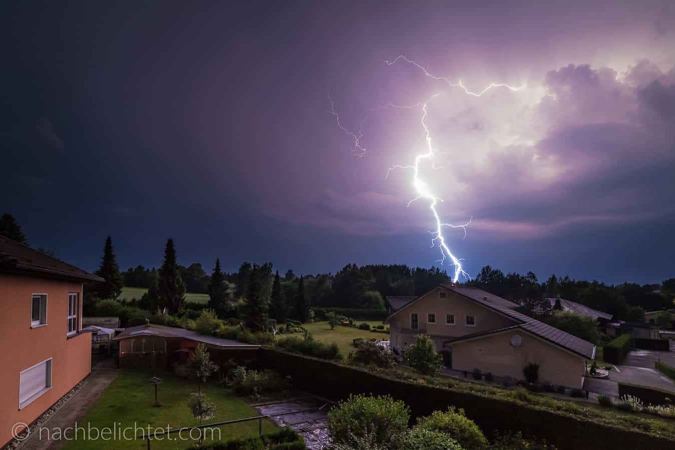 Sobald über euch Regen fällt, wird es mit den Blitzfotos nicht mehr viel, da der Regen sehr viel Kontrast und Schärfe nimmt. Auch muss man immer die Belichtung mit der Dämmerung nachziehen, damit auch die Umgebung hell genug aufgenommen wird. Der einfachste Weg dabei ist, die ISO-Empfindlichkeit schrittweise zu erhöhen. Das Foto ohne Blitz sollte dabei etwas unterbelichtet sein, da die Szene ja dann vom Gewitterblitz zusätzlich ausgeleuchtet wird.