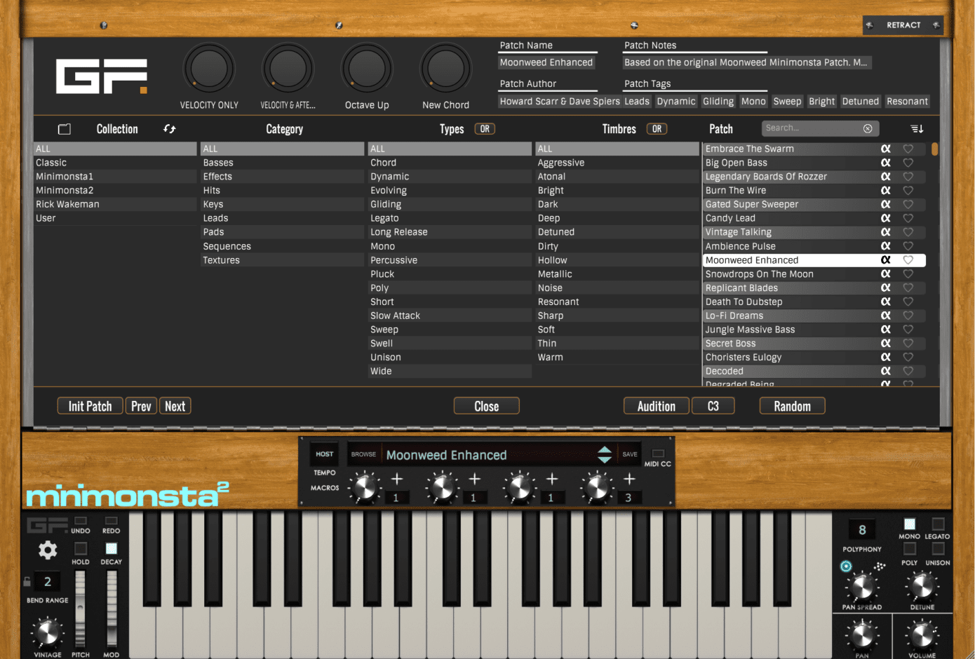 Die erste Version von Minimonsta war für die damaligen Rechner und Displays gemacht, was ich natürlich grundlegend geändert hat. Daher wird das Plugin mit einem neuen, vollständig skalierbaren UI geliefert, das in drei verschiedenen Stilen erhältlich ist: Schwarz, dunkles Holz und helles Holz. Außerdem erhältst du einen komplett neuen Preset-Browser mit Tags und anderen Kategorien.
