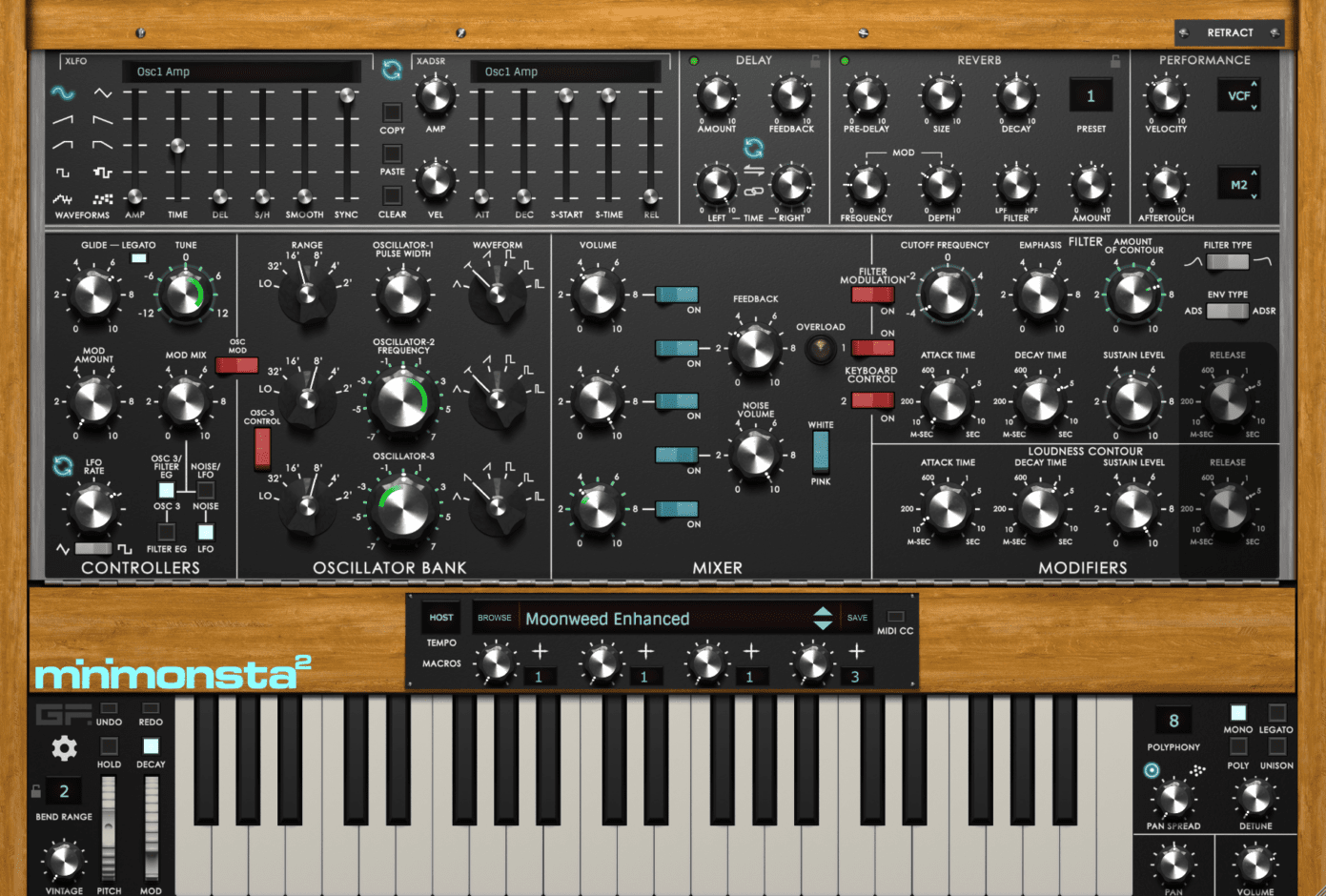 Gforce Software verpasste jetzt seiner hochwertigen Minimoog-Emulator Minimonsta eine Frischzellenkur und mit Version 2 eine neue skalierbare UI, mehr Funktionen, mehr Authentizität und mehr. Das Plugin bietet dir alle Originalfunktionen, einschließlich der drei fetten Oszillatoren und des berühmten 4-Pol-, 24 dB/Oktave-Filters. Was ich immer sehr gut finde ist, wenn man sich nicht sklavisch an das Vorbild und es um nützliche moderne Funktionen erweitert, was beim Minimonsta 2 der Fall ist.
