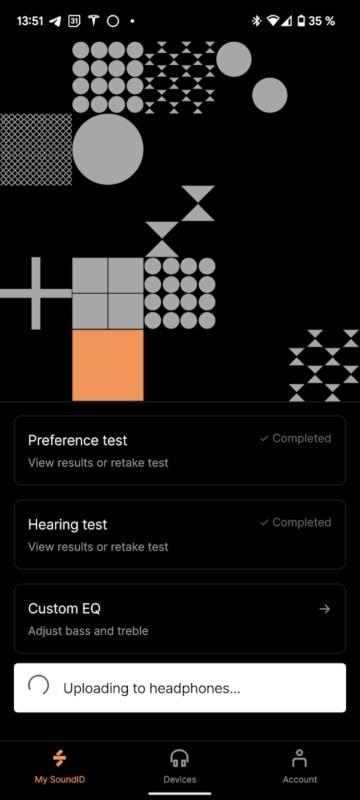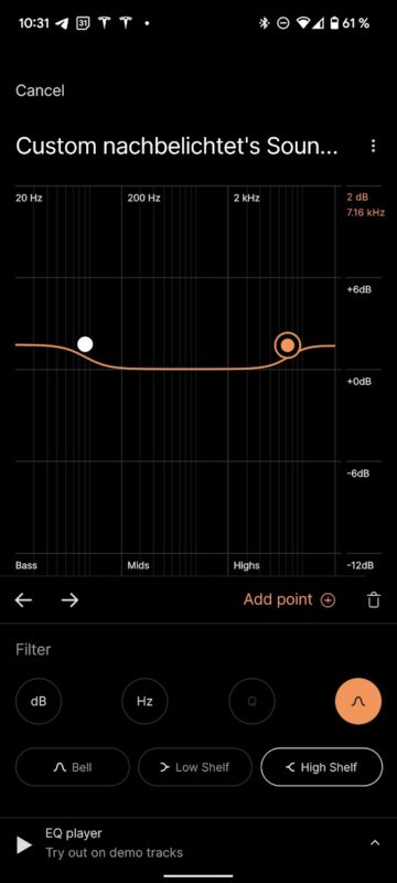 Machen wir gleich bei der SoundID App weiter. Nachdem man den TWS/1 gekoppelt und die App heruntergeladen hat, wird man zunächst nach den eigenen Sound-Vorlieben anhand von Beispielen gefragt. Danach folgt ein Hörtest, den man in leiser Umgebung machen sollte. Dabei wird gemessen, wie gut man auf jedem Ohr hört. Damit ist eine ideale Anpassung an das eigene Hörempfinden möglich, was zu einem sehr transparenten und knackigen Sound führt. Gerade der wichtige Mitten- und Bassbereich ist sehr straff und transparent. Wer hier noch selbst optimieren möchte, kann auf den Custom EQ zurückgreifen, der sogar einen parametrischen Equalizer bietet. Man kann bis zu 3 Profile als Presets abspeichern.