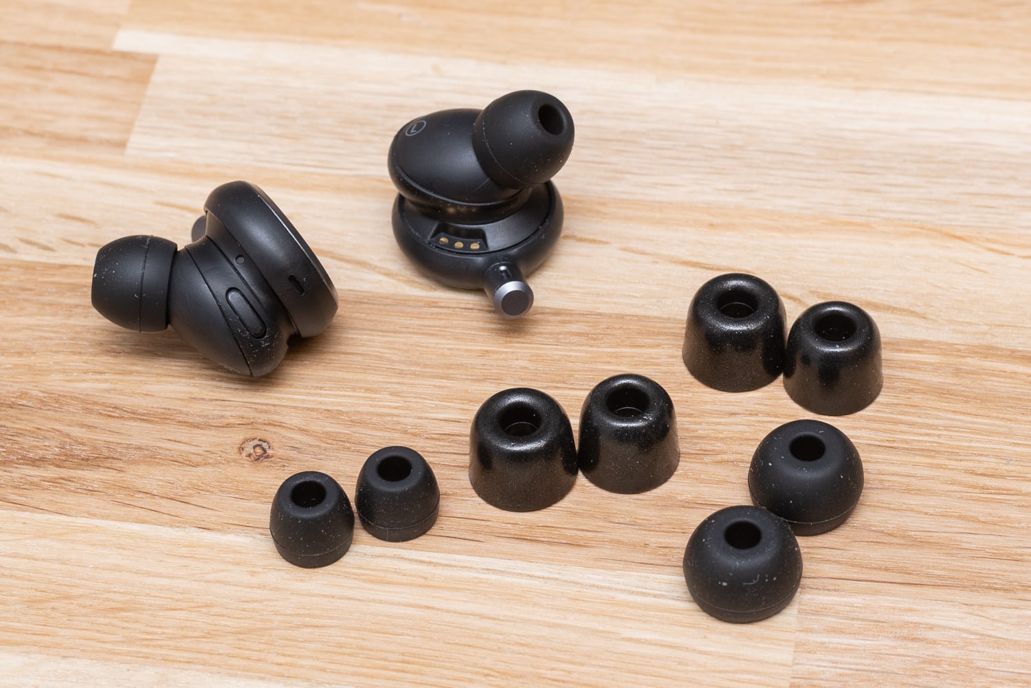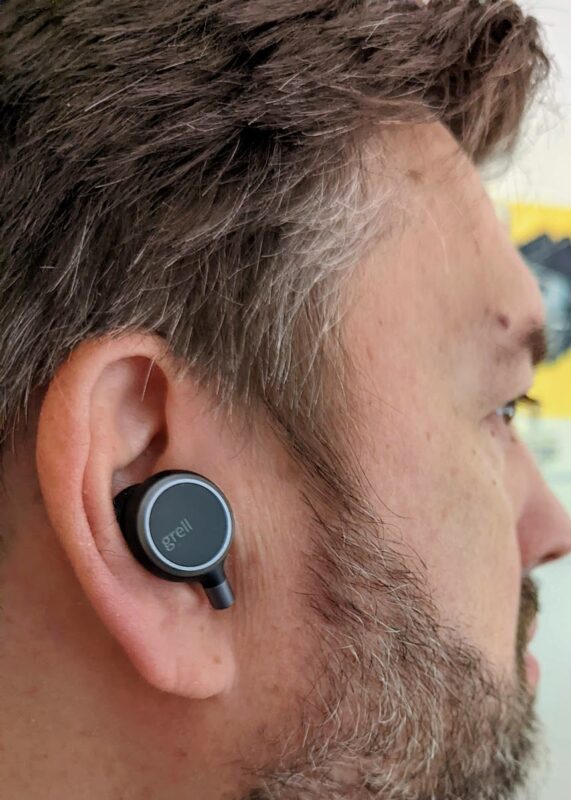 Im Gegensatz zu vielen anderen Gummieinsätzen bestehen die von Grell aus einem sehr flexiblen und weichen Kunststoff, der sich im Ohr etwas ausdehnt. Damit halten die TWS/1 nicht nur sicher im Ohr, sondern dichten auch schon passiv ausgezeichnet gegen Umgebungsgeräusche ab.